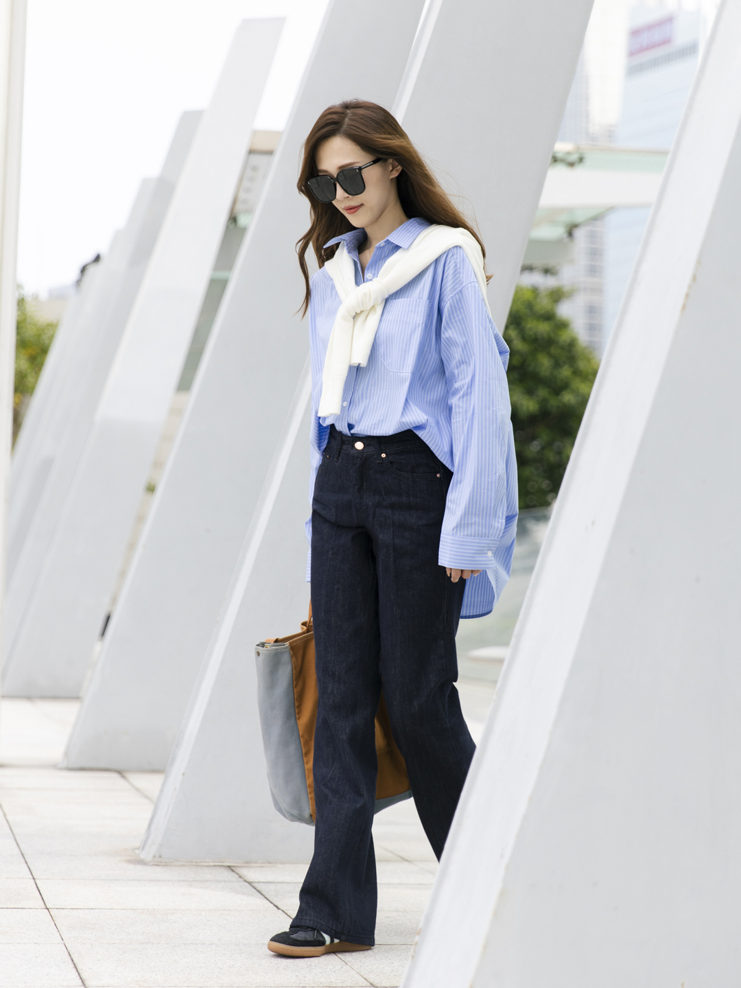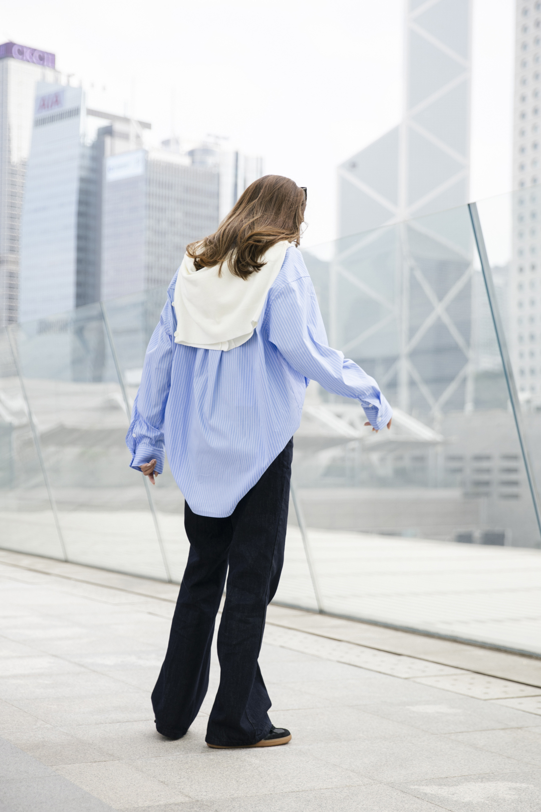 中性鬆身剪裁的白恤衫,如黑咖啡一樣簡約經典,經典間條恤衫,細緻白條子之間藏藍線,顯得溫文,讓都市中為生活忙碌的你加添laid back感,造型從容自在。