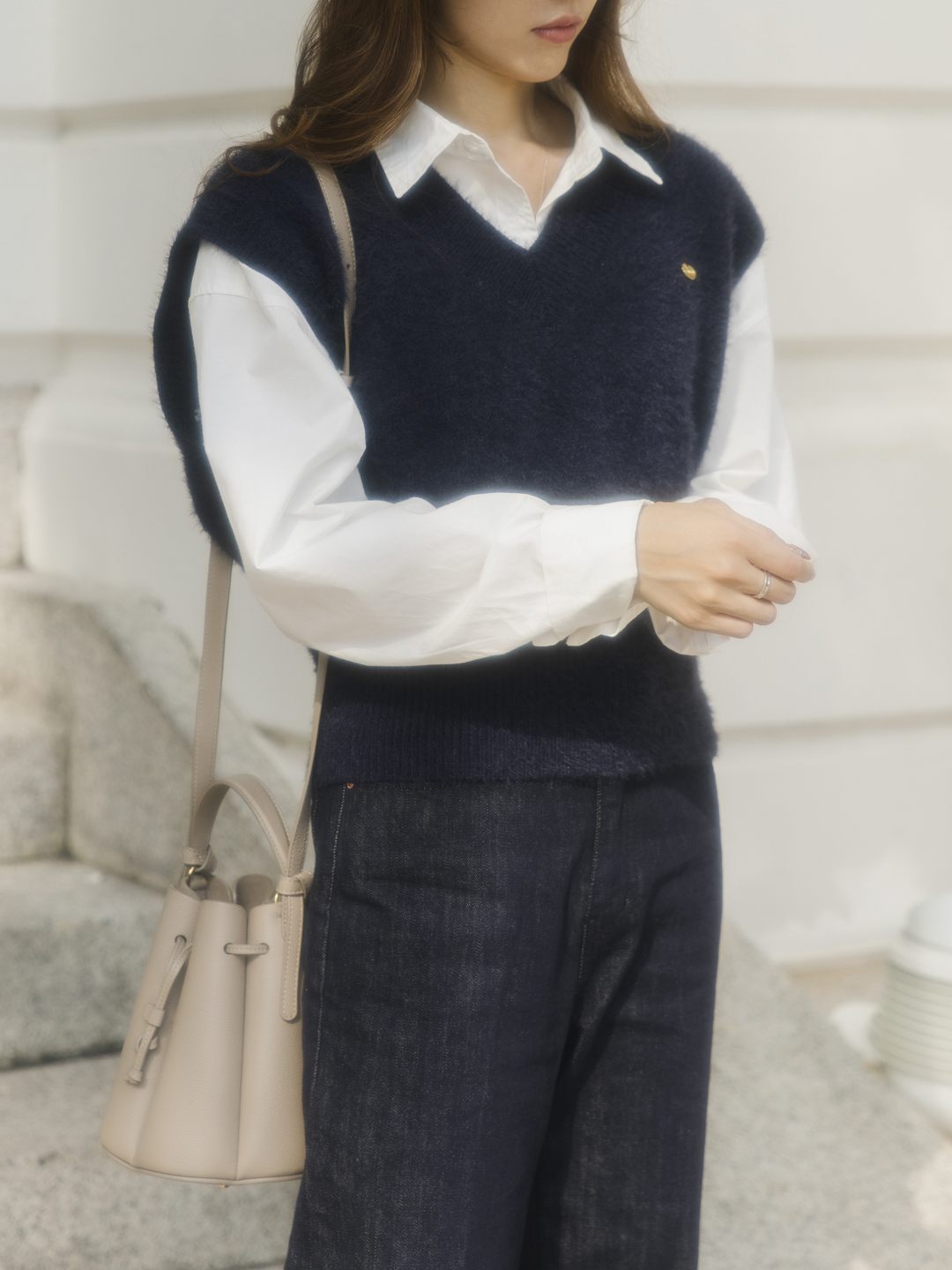 韓式特別之處在於腰間附有側扣的另類穿法,顯瘦之餘有性格。於肩上輕搭白色針織開胸毛衣,整個Total Look更有層次!