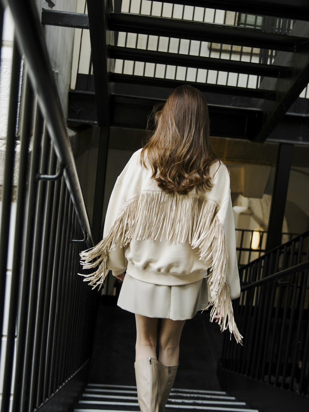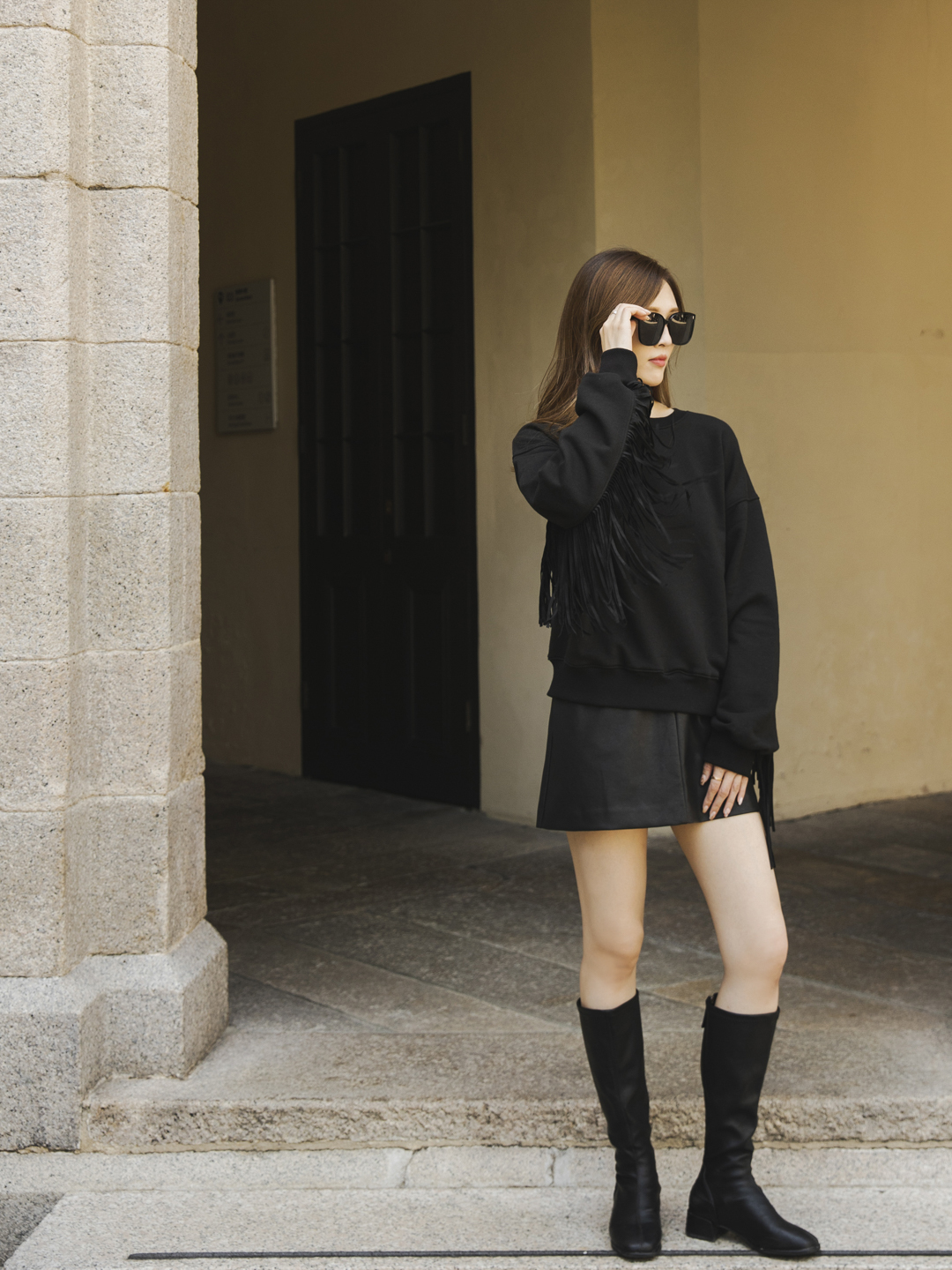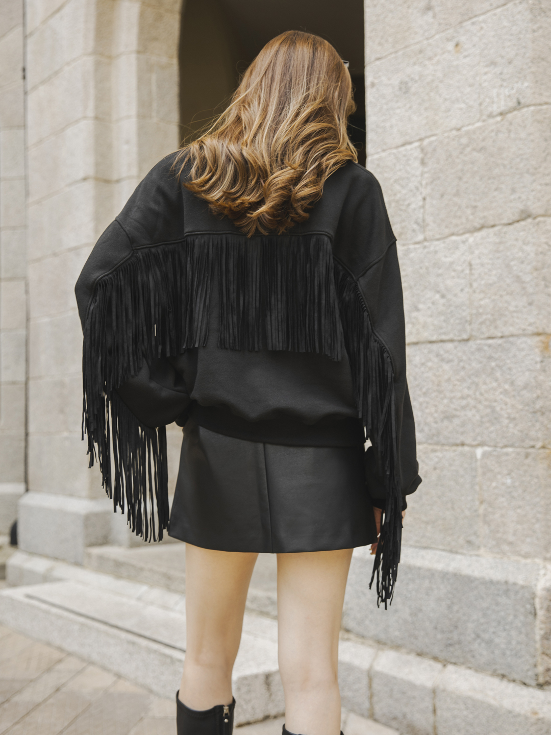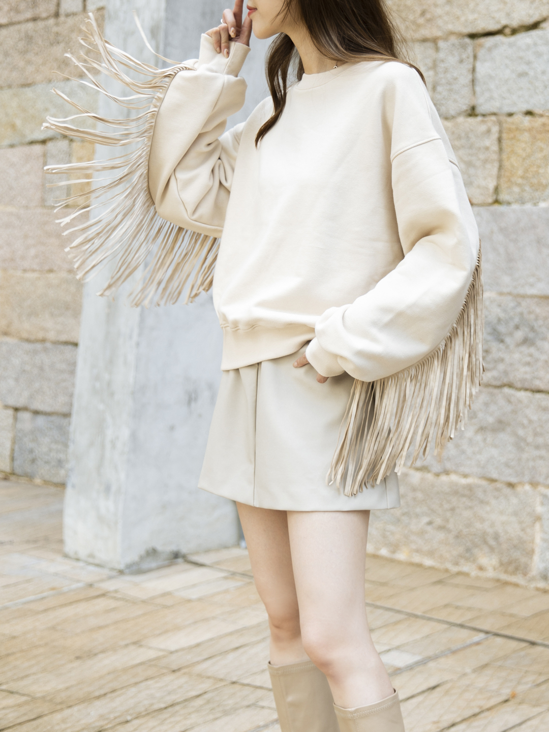 不落俗的衛衣,風格不羈的流蘇從背部延伸到手袖,走路時灑脫又自由,彷彿要穿着來一趟無拘無束的Road Trip之旅。🏜️配搭店主為你搜羅的同色系仿皮短裙,造型更完整!