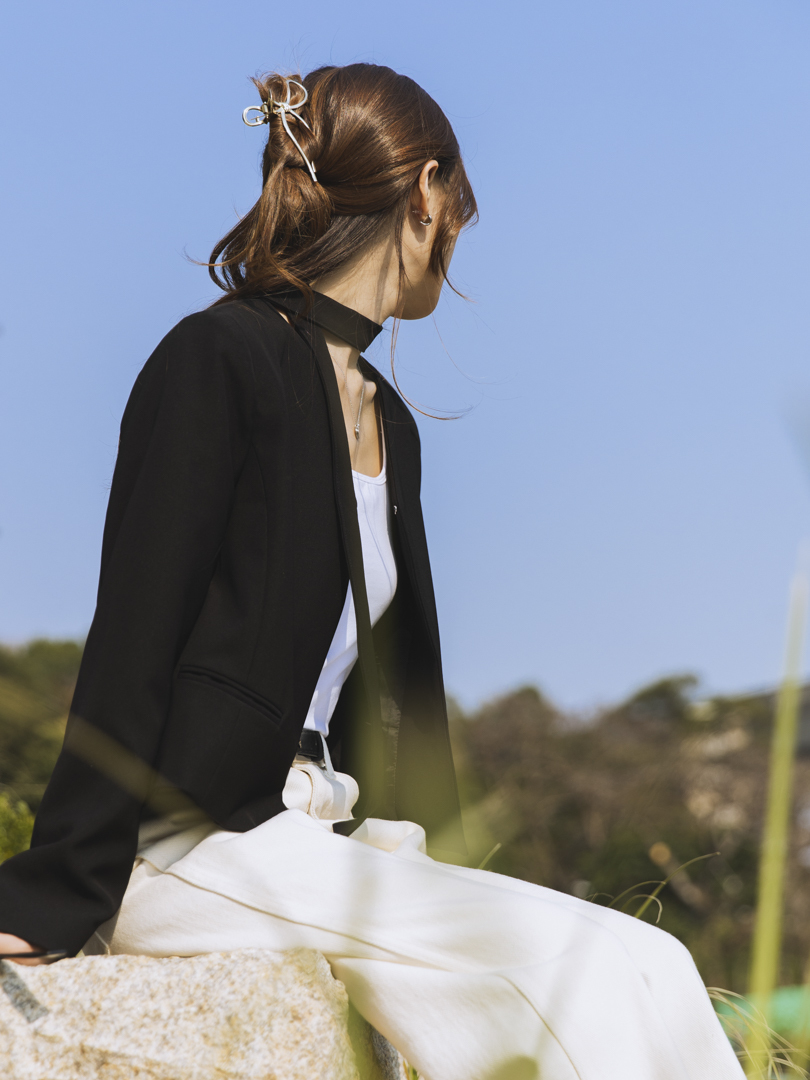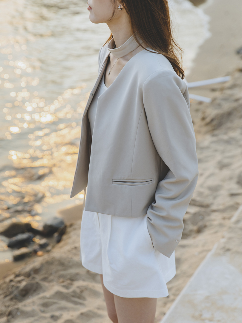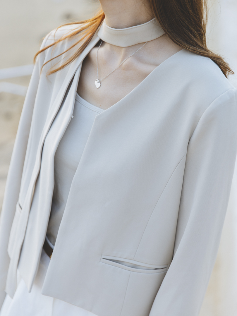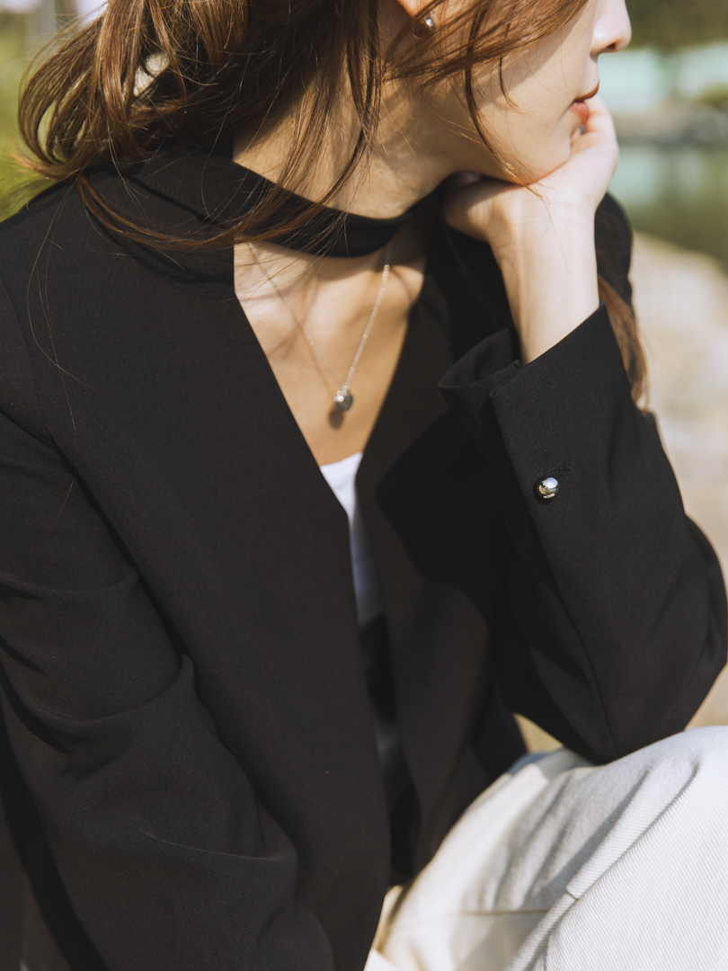 特色可拆式的頸帶設計,讓一件衣服同時擁有兩種風格。佩戴頸帶,即提升整體造型的正式感與層次感;卸下後,則轉為得體俐落的現代極簡風,靈活搭配日常需求。修飾腰線的直身設計,打造柔美的身形輪廓,而無領口的西裝剪裁簡約,完美呈現「低調中的高級感」。