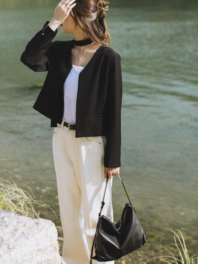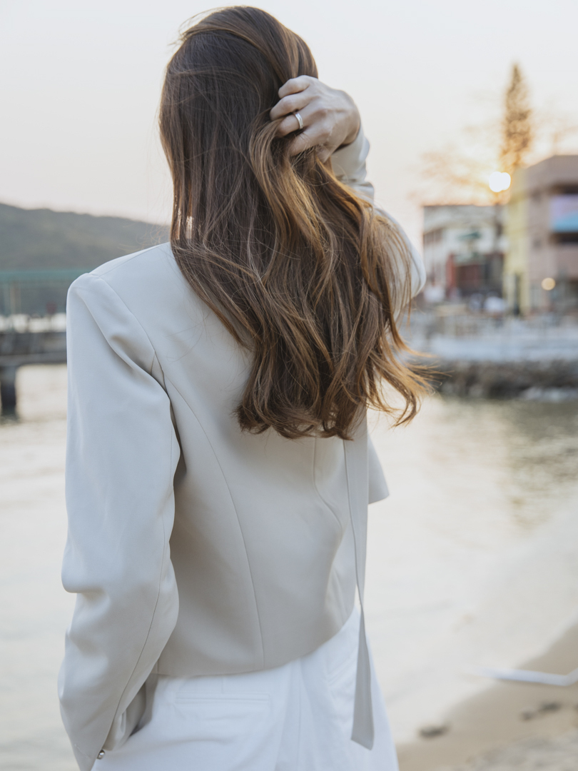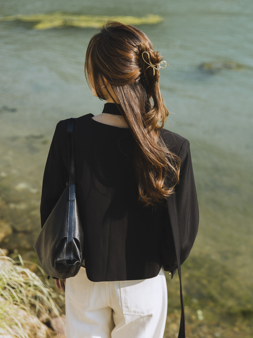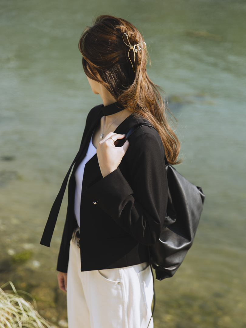 特色可拆式的頸帶設計,讓一件衣服同時擁有兩種風格。佩戴頸帶,即提升整體造型的正式感與層次感;卸下後,則轉為得體俐落的現代極簡風,靈活搭配日常需求。修飾腰線的直身設計,打造柔美的身形輪廓,而無領口的西裝剪裁簡約,完美呈現「低調中的高級感」。