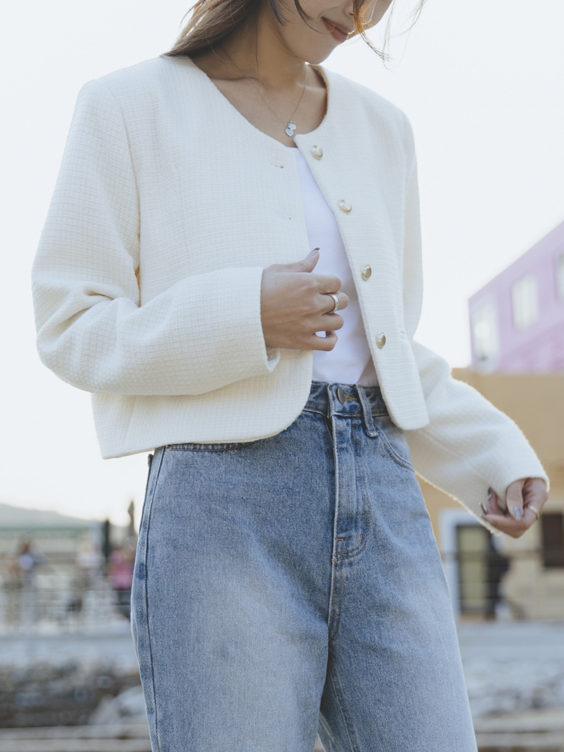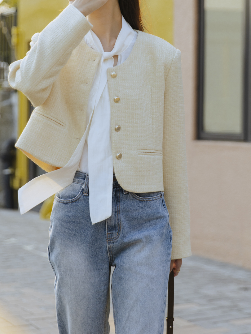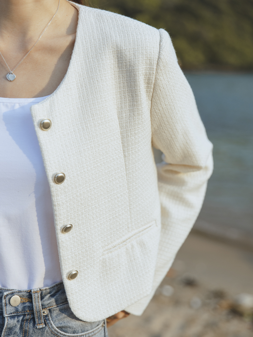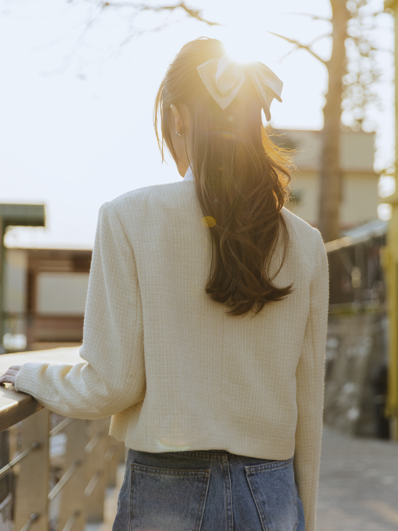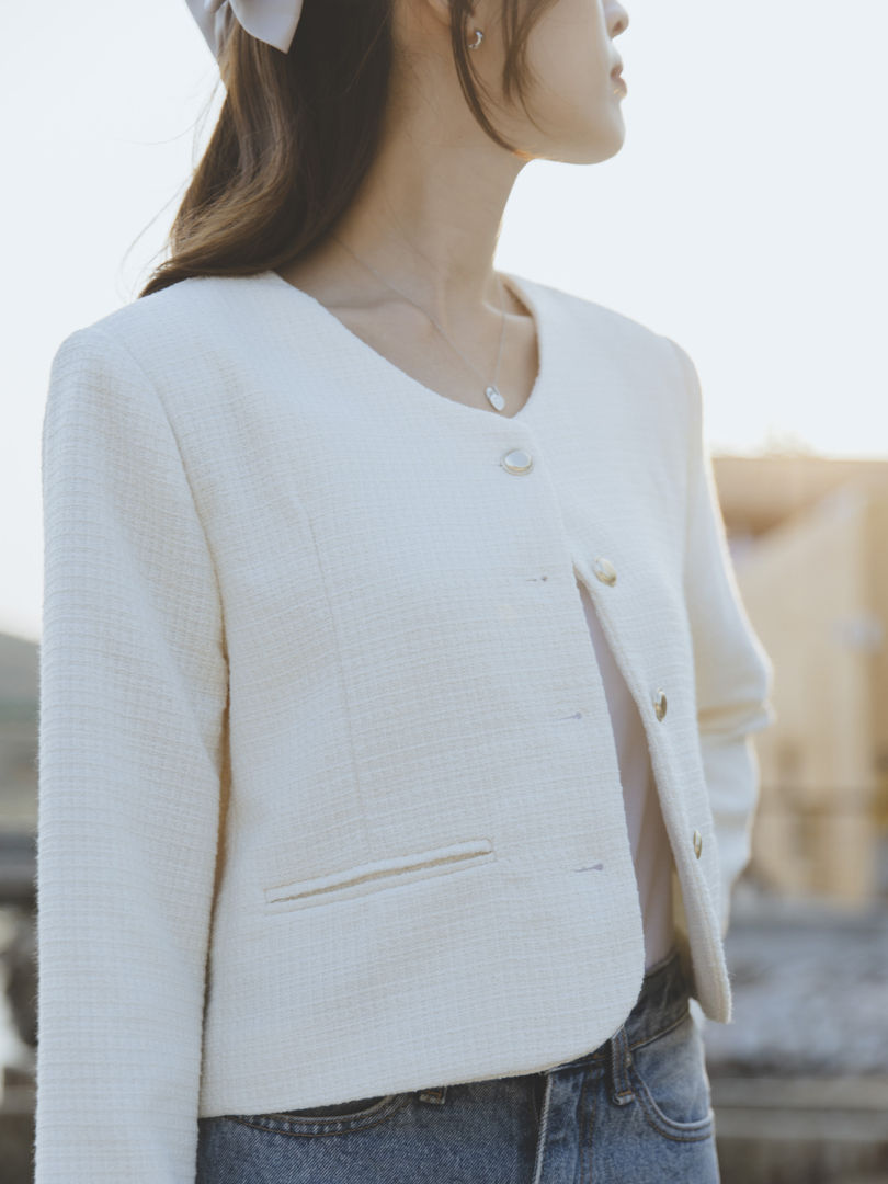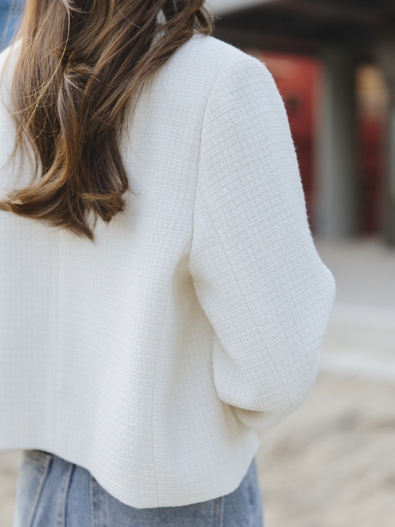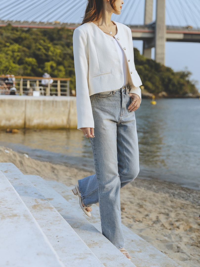 選用高質的粗花呢面料,觸感細緻、紋理分明、挺度恰好,沒有多餘裝飾,精緻的磨砂面金釦呈現自然光澤感,讓整體看起來乾淨而有高級感。短版版型有效拉長下身比例,打造視覺上的高腰線,特別適合亞洲女性的身形,柔和卻有氣勢。即使不加思索地搭配基本白T、牛仔褲或長裙都極為修身好看,散發出低調的魅力。