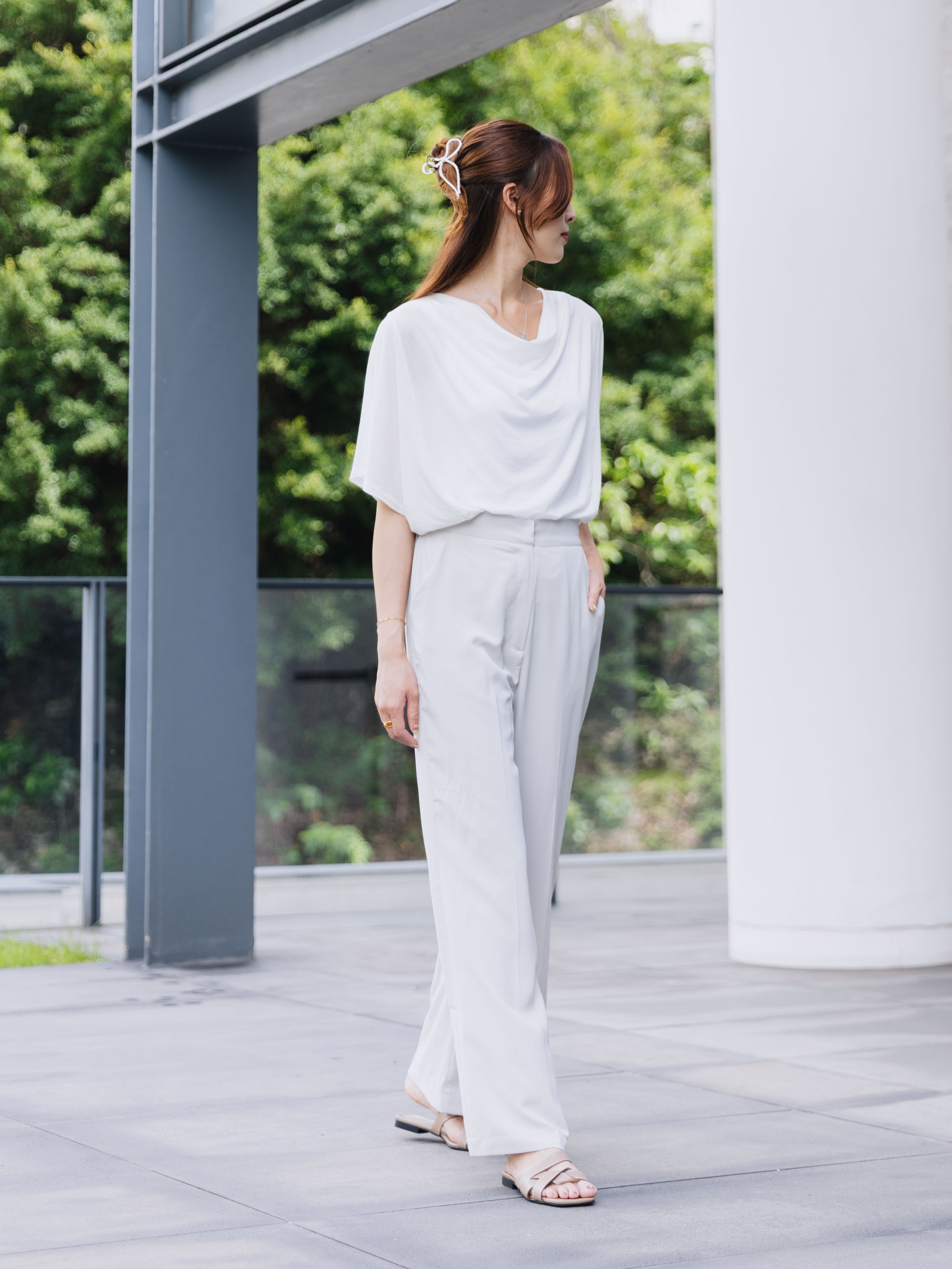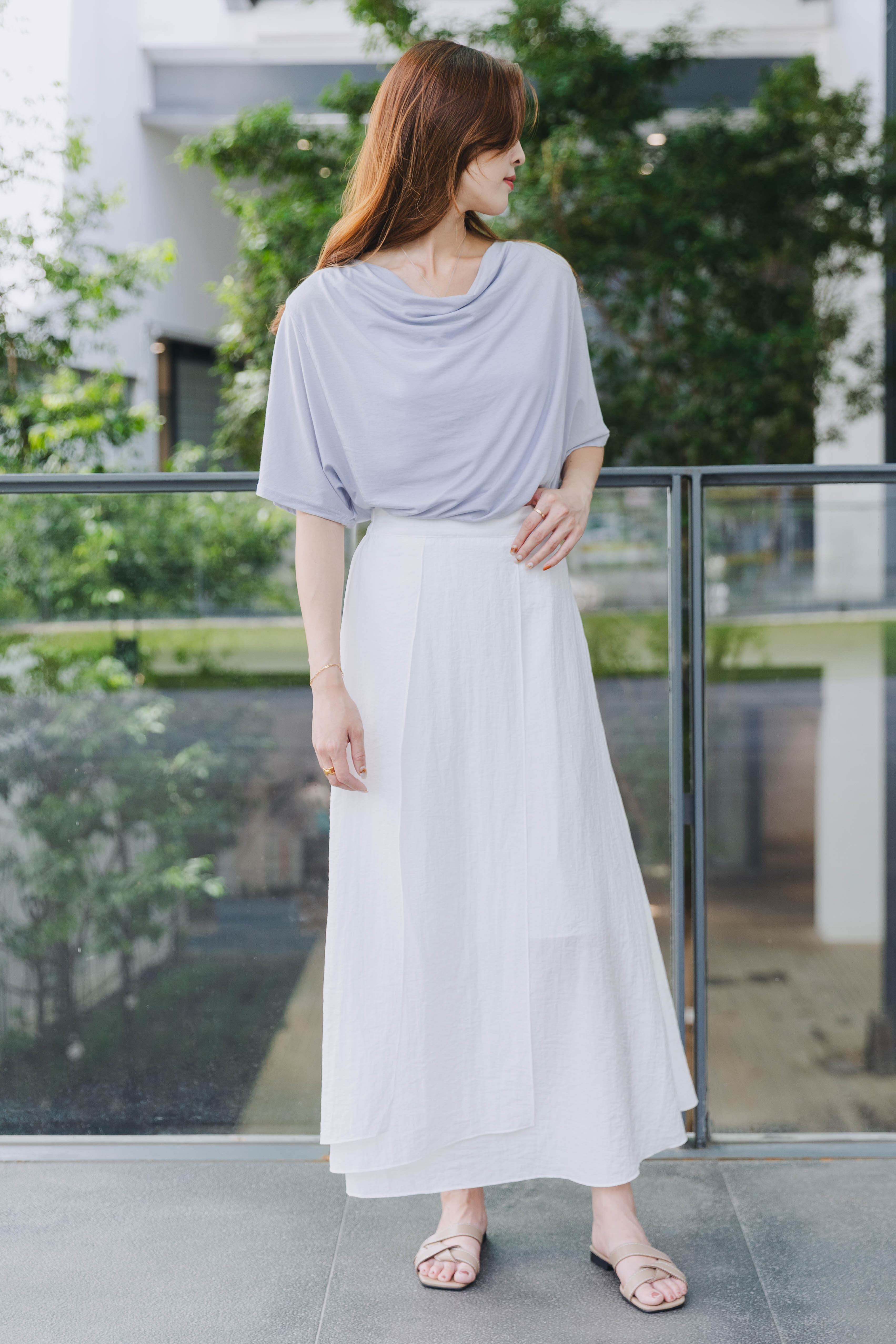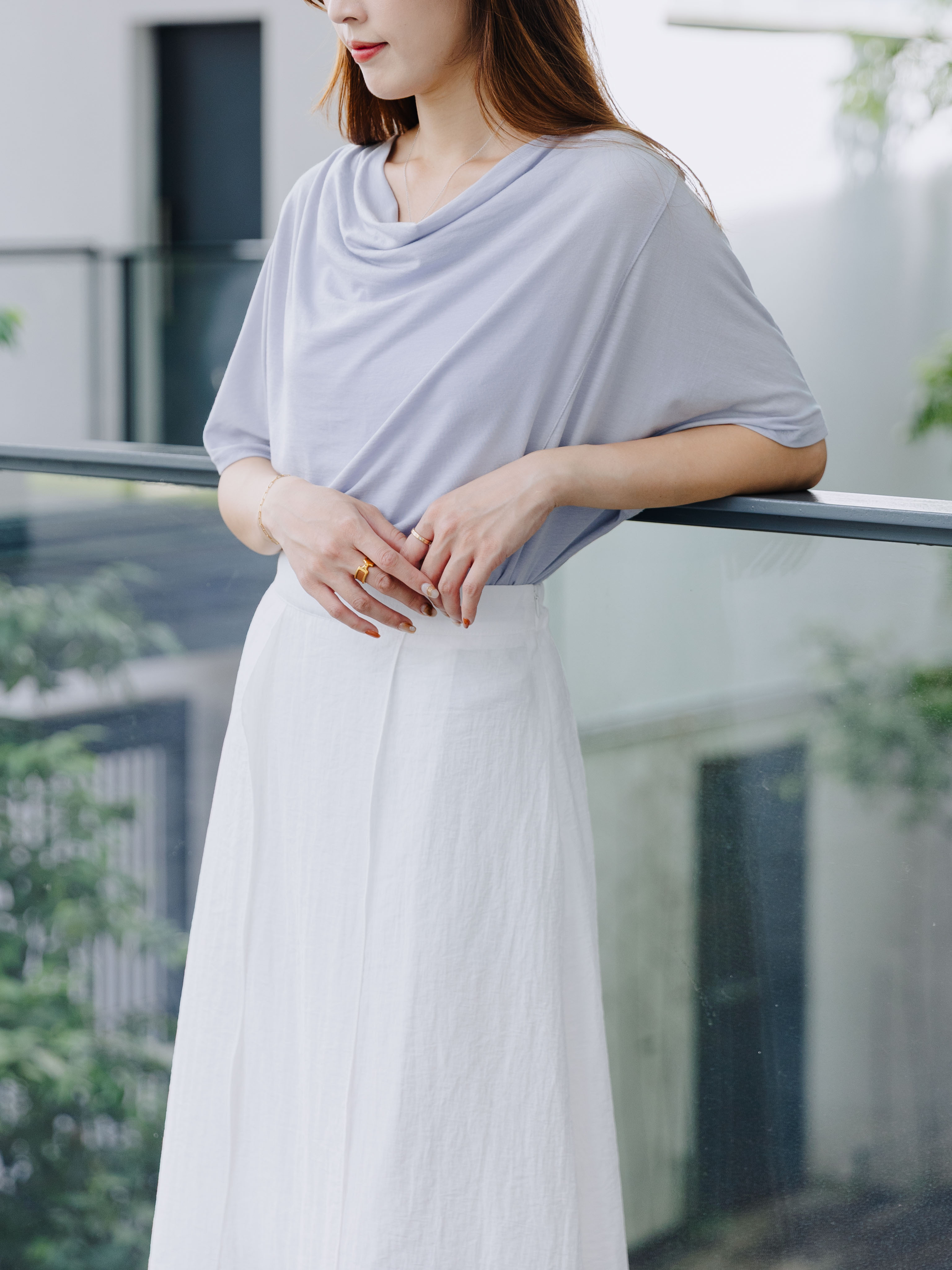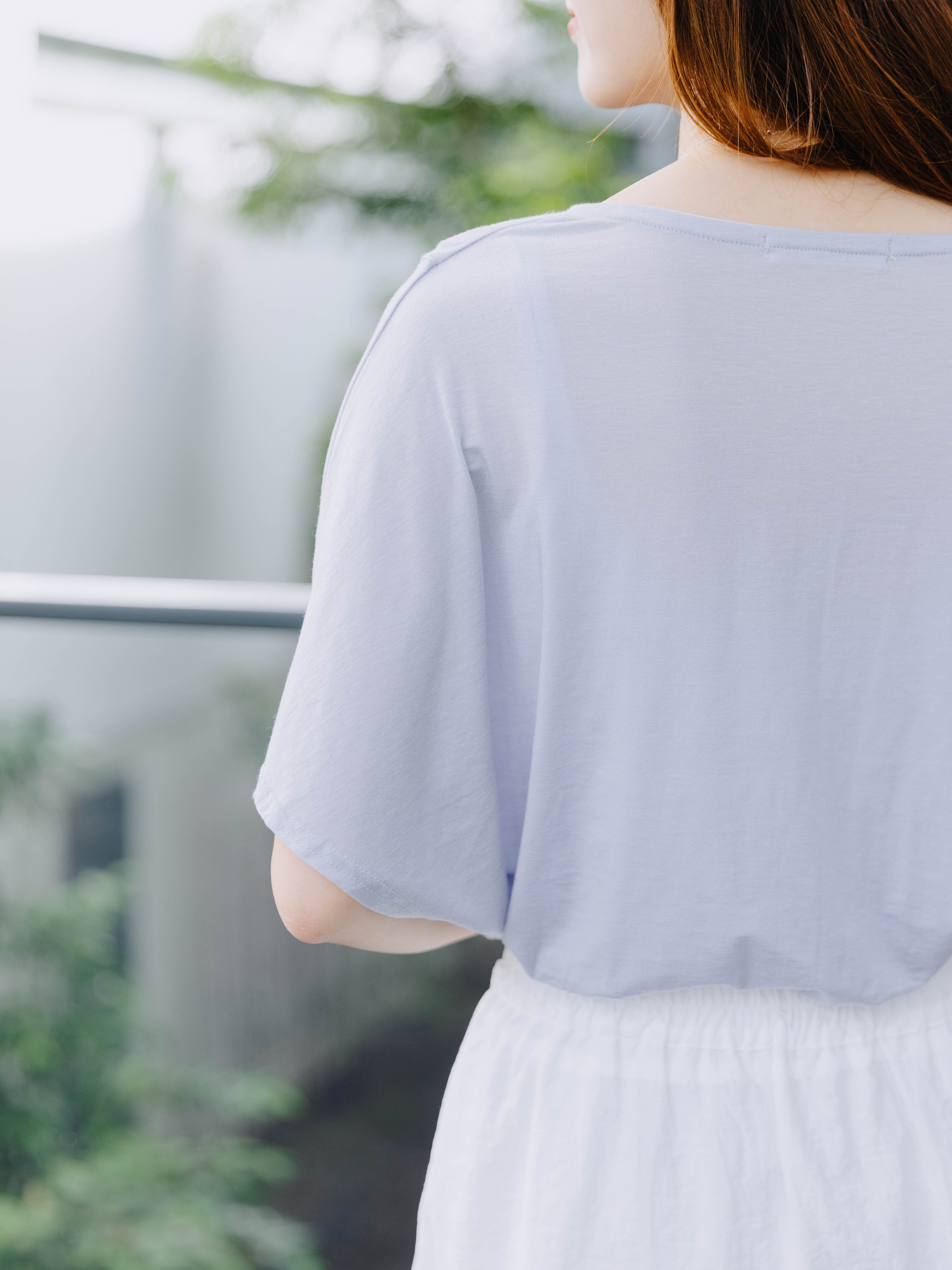 柔順度讓人驚喜的滑面布料,逾九成天絲成份加上Span彈性纖維,舒適而帶延展性。垂墜設計領口充滿知性美,配以蝙蝠袖造型更通爽,同時有效修飾上手臂線條。長春花藍調與基礎白色皆為夏日必收之選。