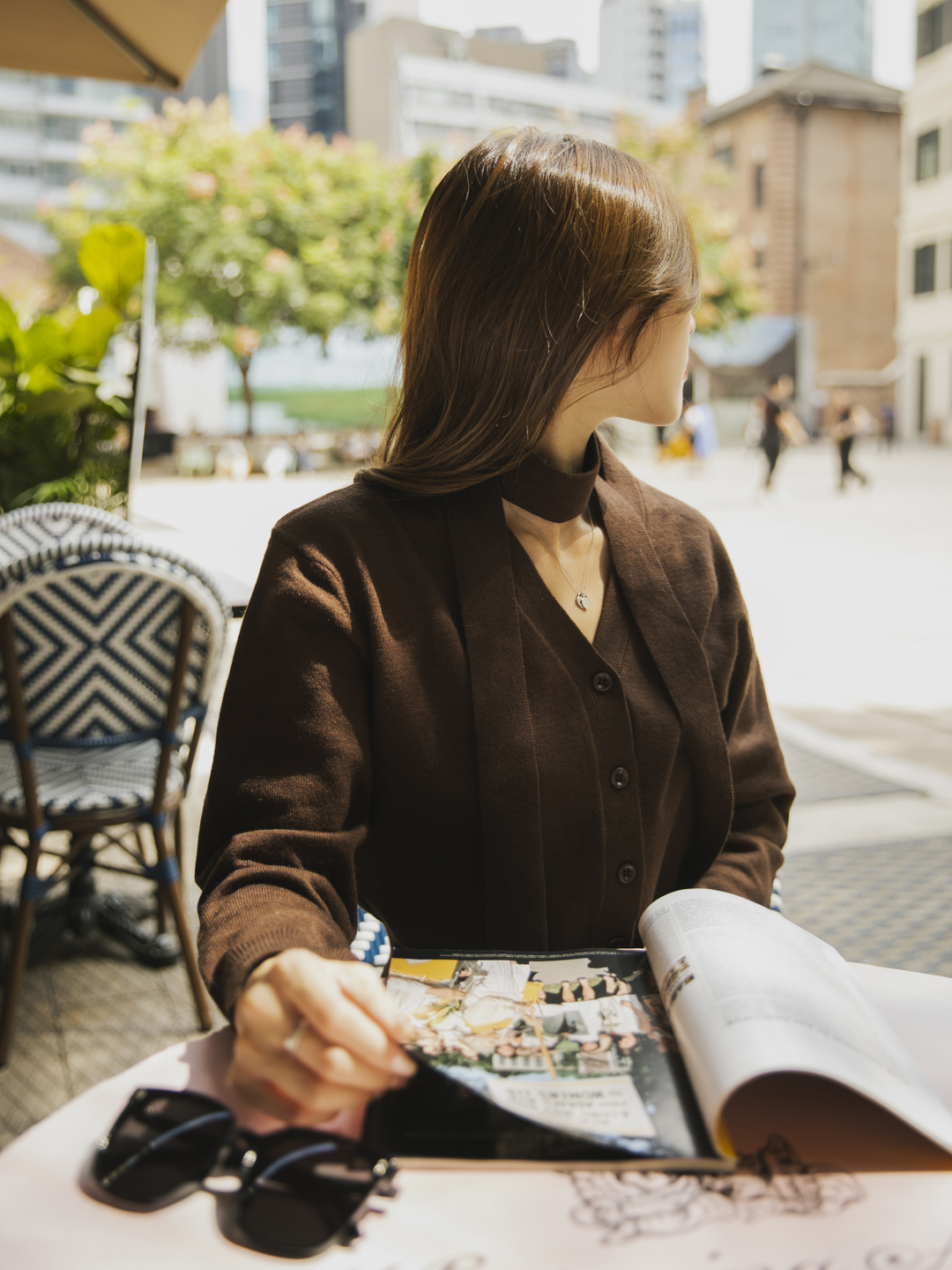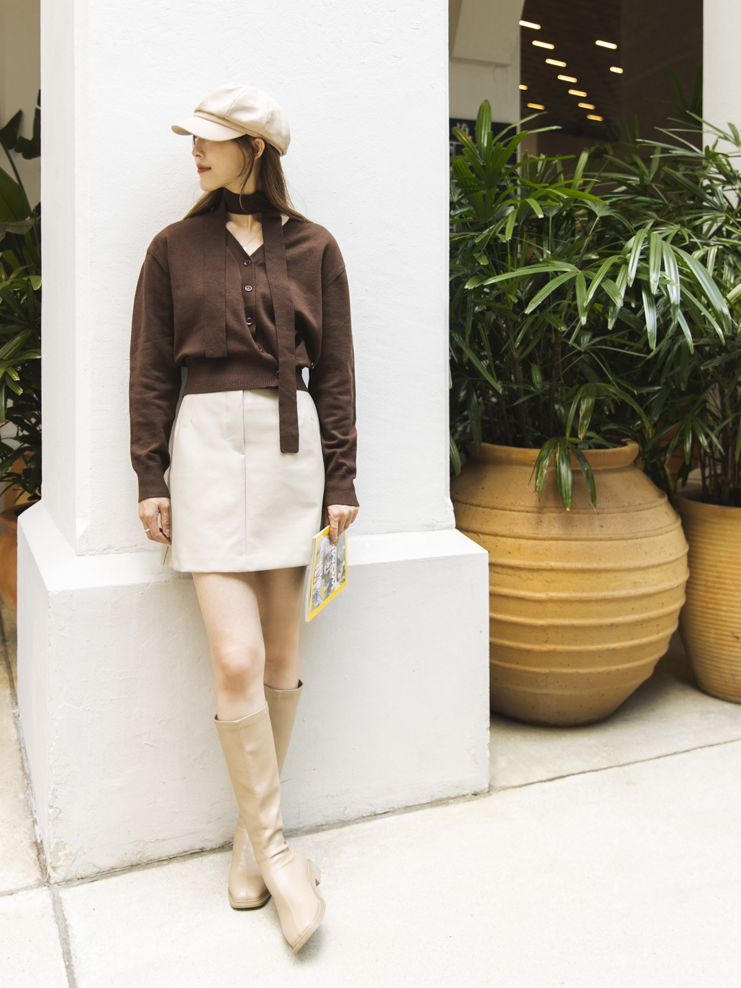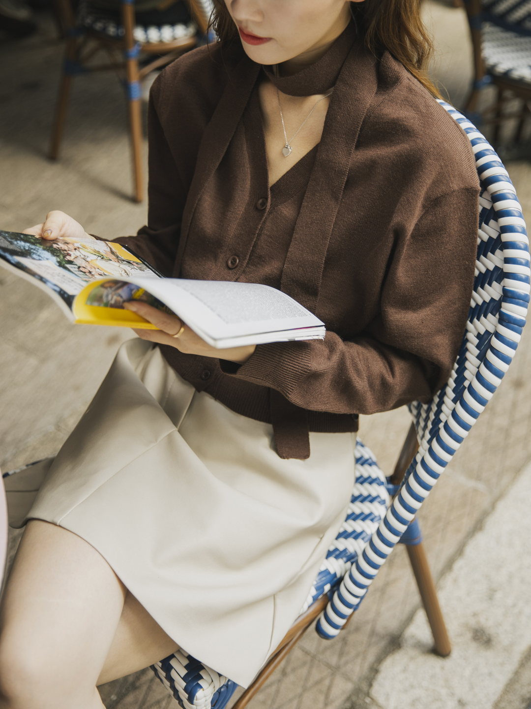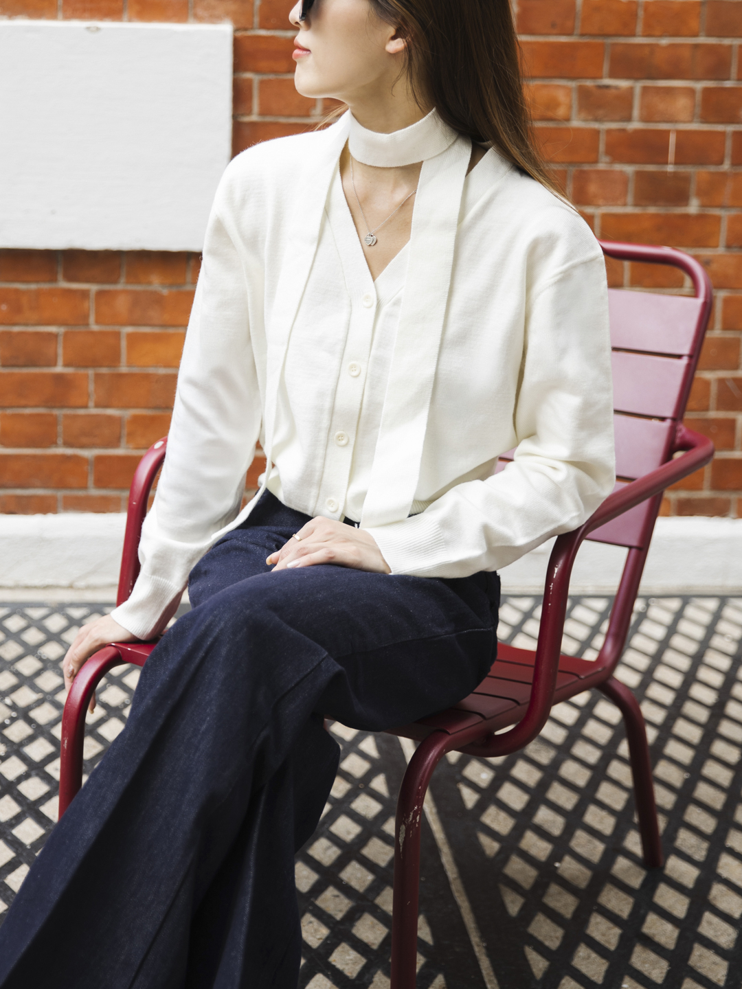 微涼秋意下,掛頸的幼帶便顯得恰到好處,針織上衣連同色頸帶的配搭,衣擺收窄設計更帶出修腰效果,毫不費力地勾勒出精緻又優美的氣質。