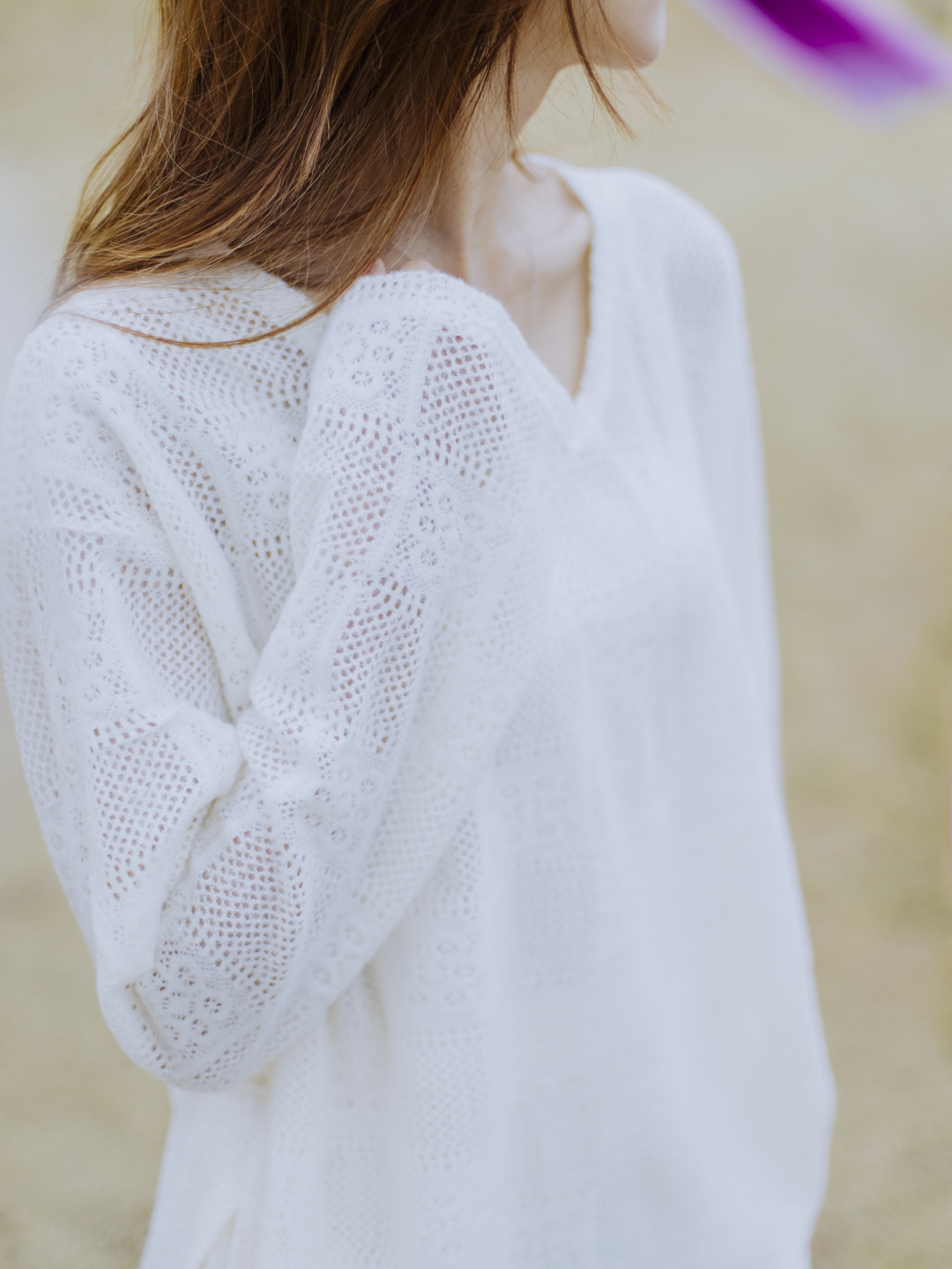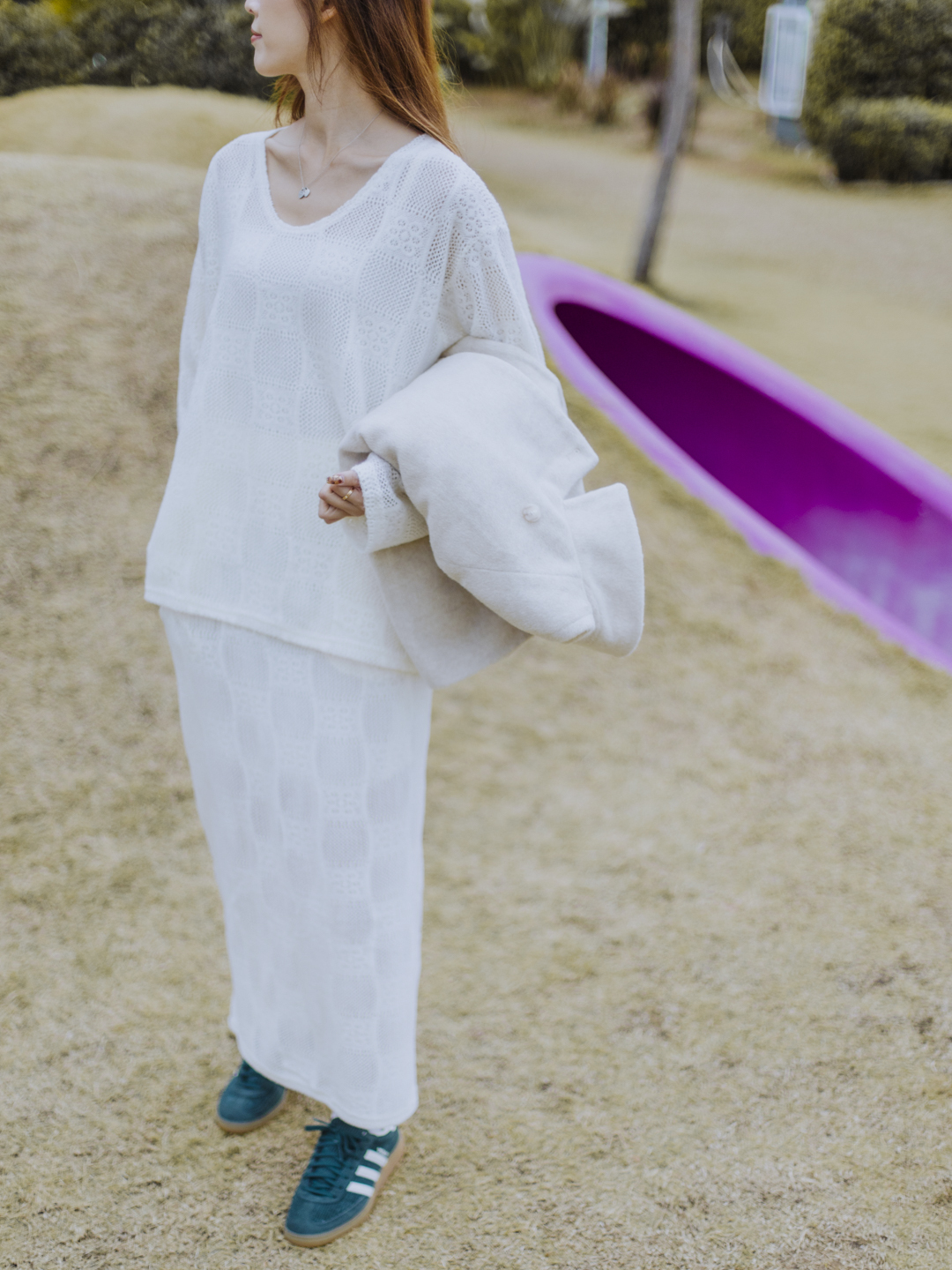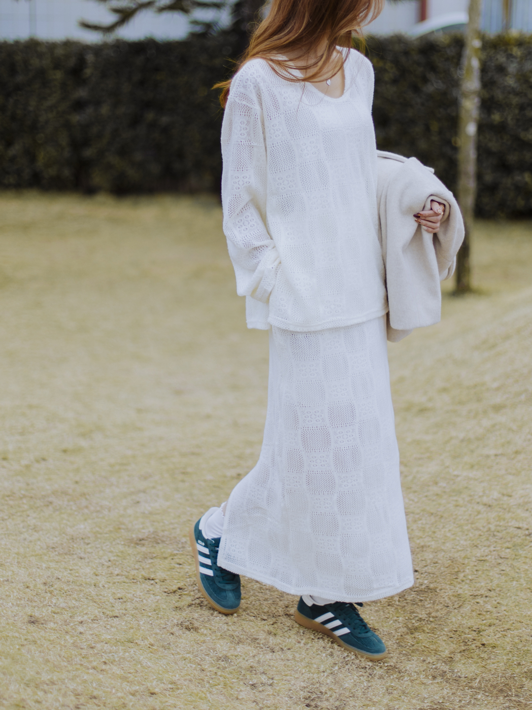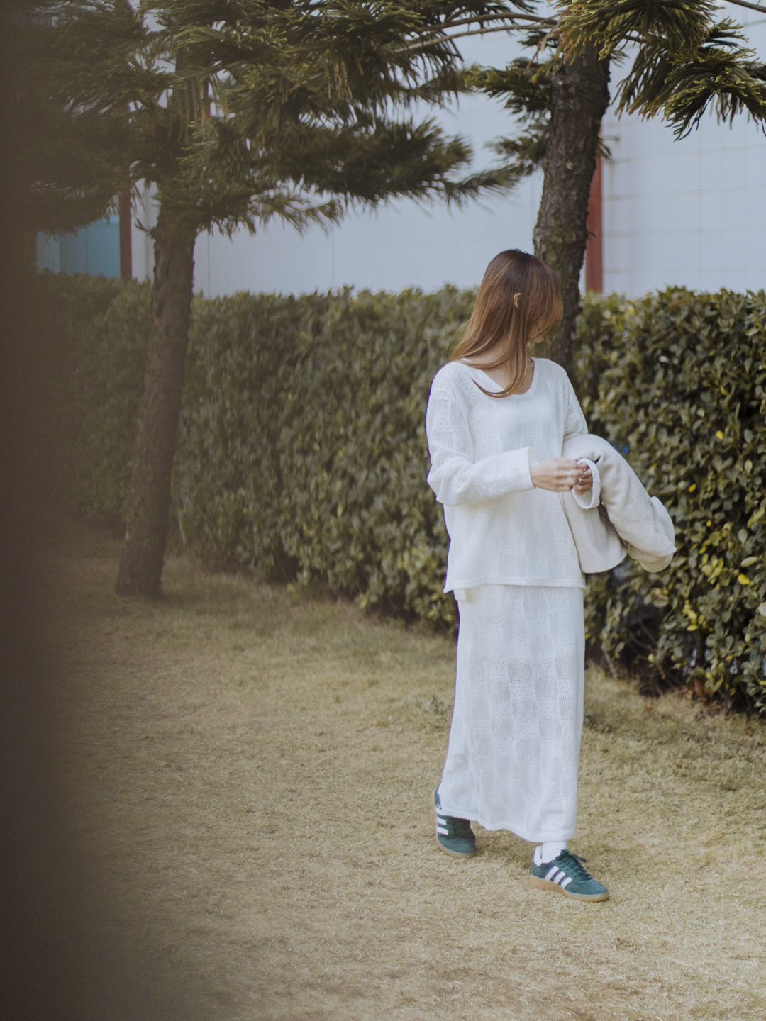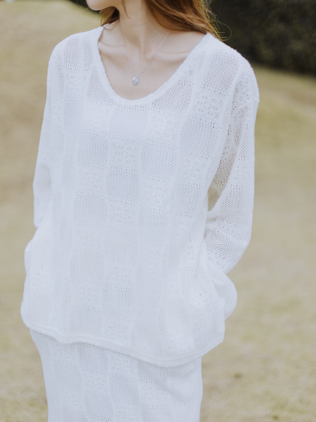 鏤空通花設計點綴雪白軟綿的套裝,立即顯得不單調,富柔美的精緻感。橡筋頭裙裝有內裡布,後擺開叉,帶層次而方便穿着,配襯外套則更時尚。