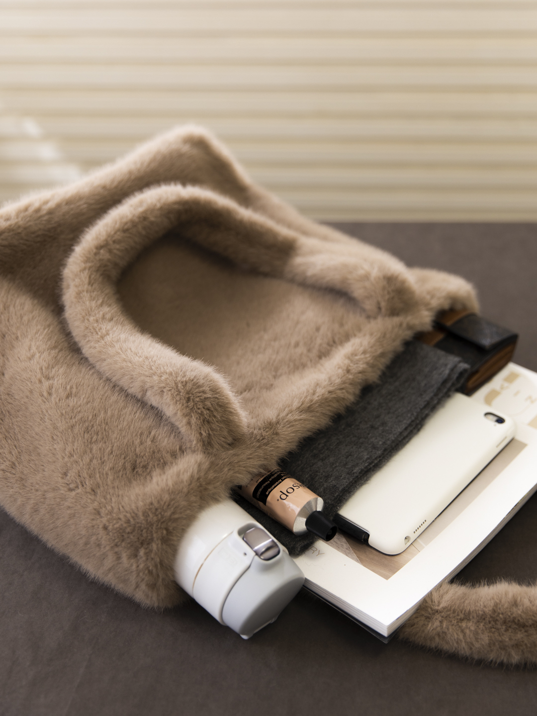 冬日感滿分的毛毛手袋。厚毛質感順滑,細節令人驚艷,闊底容量大,而且有多重間隔,能容納一切日常所需如iPad、暖水壺、雜誌、頸巾、護手霜、錢包等等,完美配襯毛衣、編織物穿搭之選。