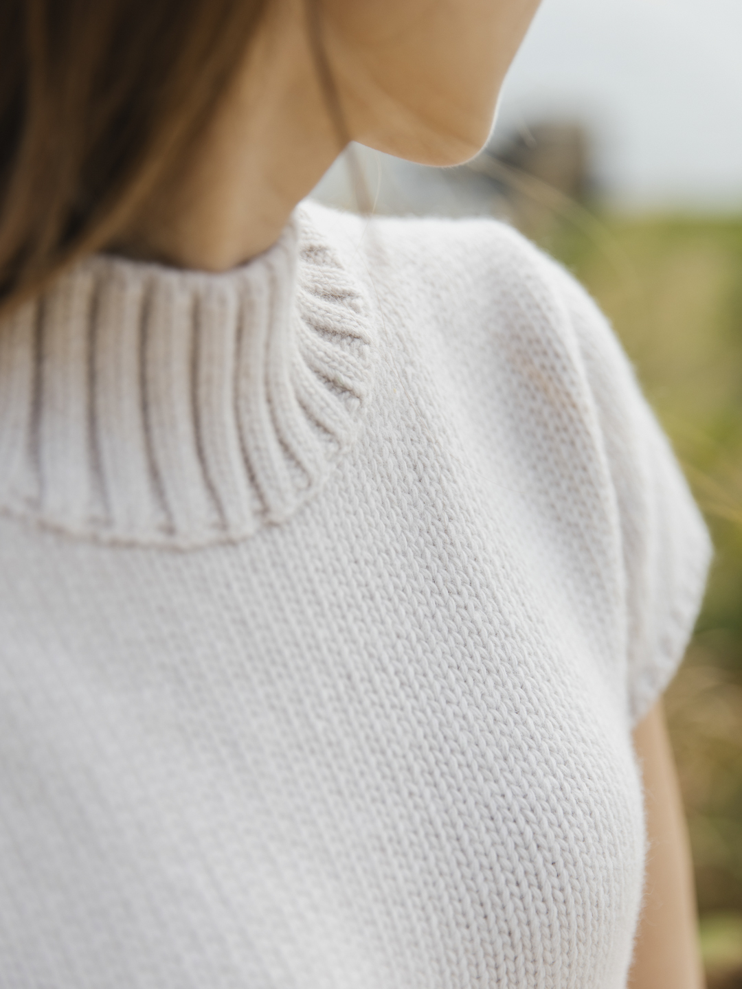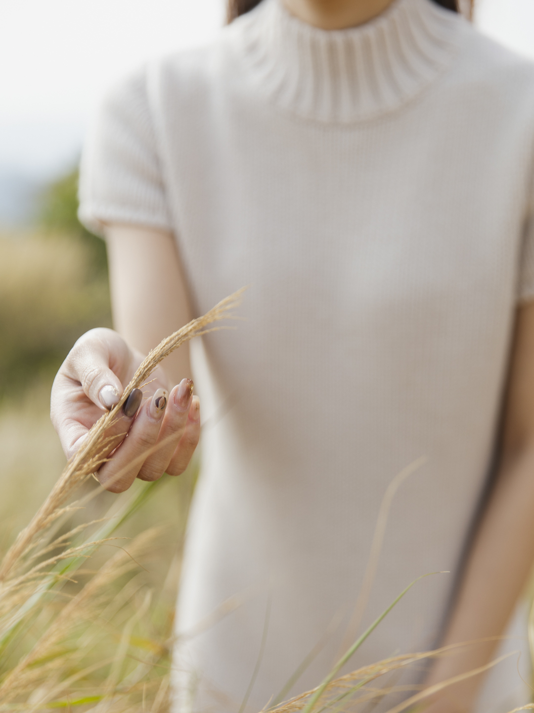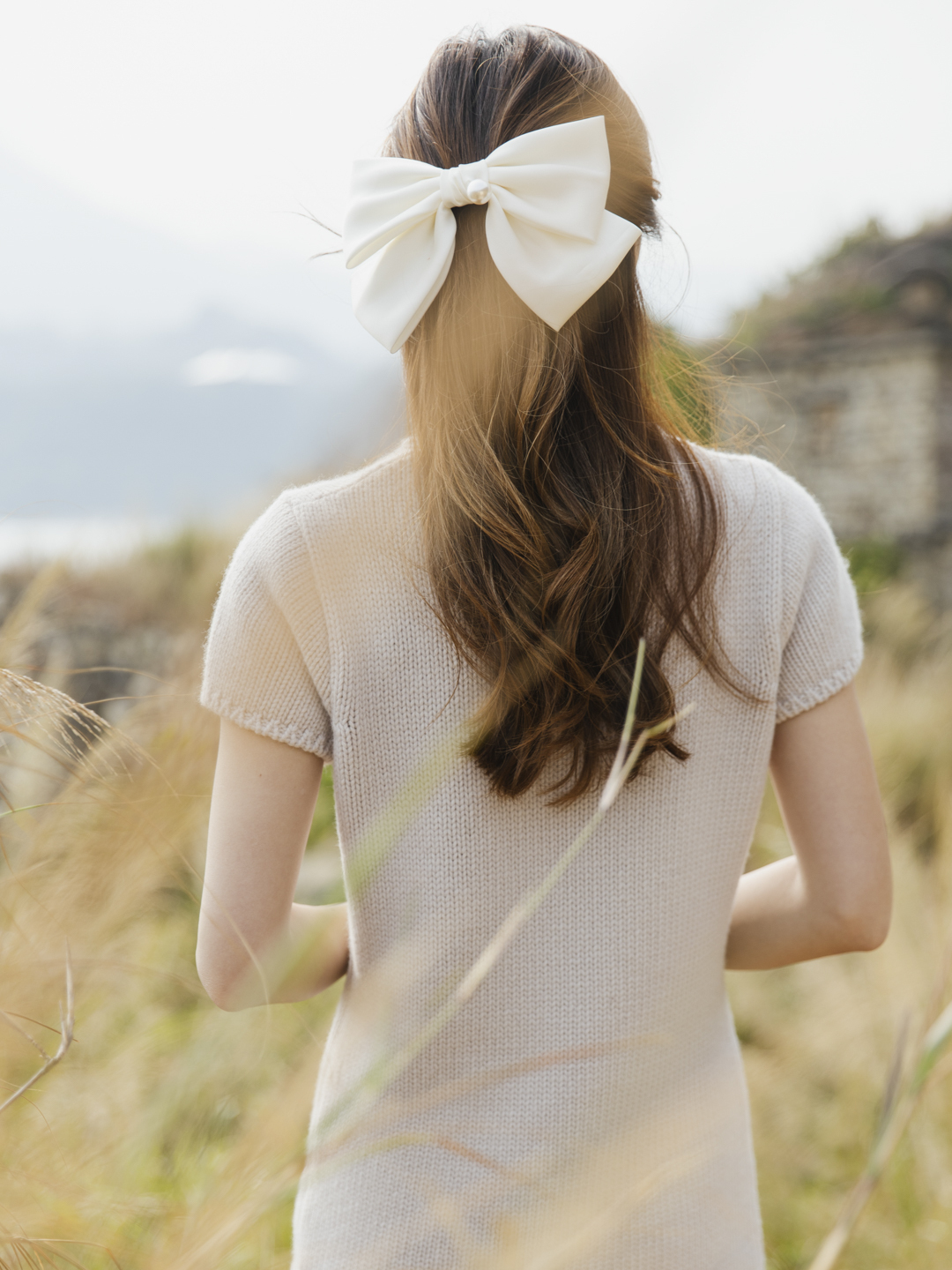 手工質感的包邊針織裙,親膚又軟綿,Merino Wool成份讓人穿上有暖暖的包覆感,陶瓷般淡米色更顯高雅。短袖設計減去冬日臃腫之態,加配外套時亦方便應付出入室內外溫差。