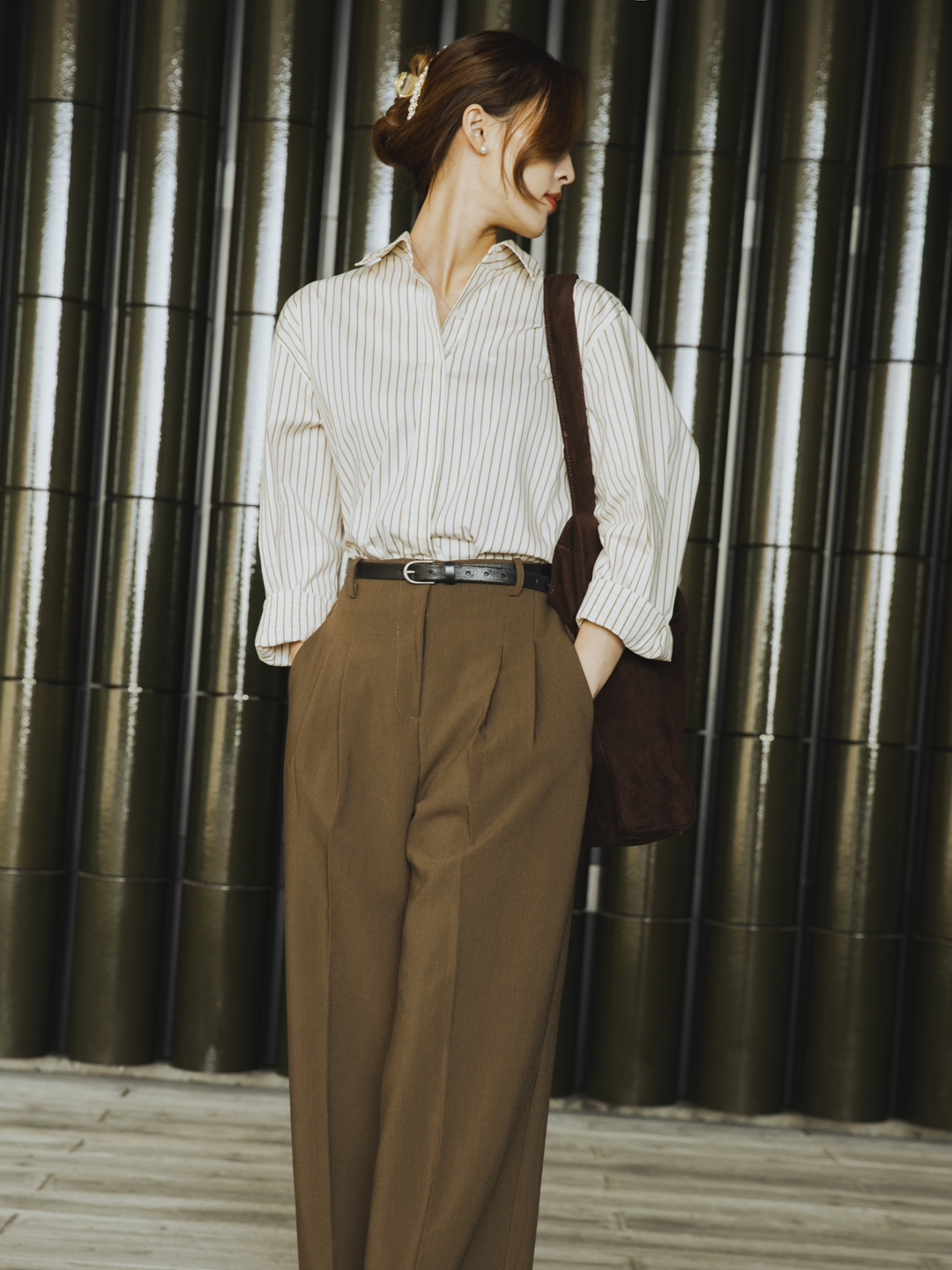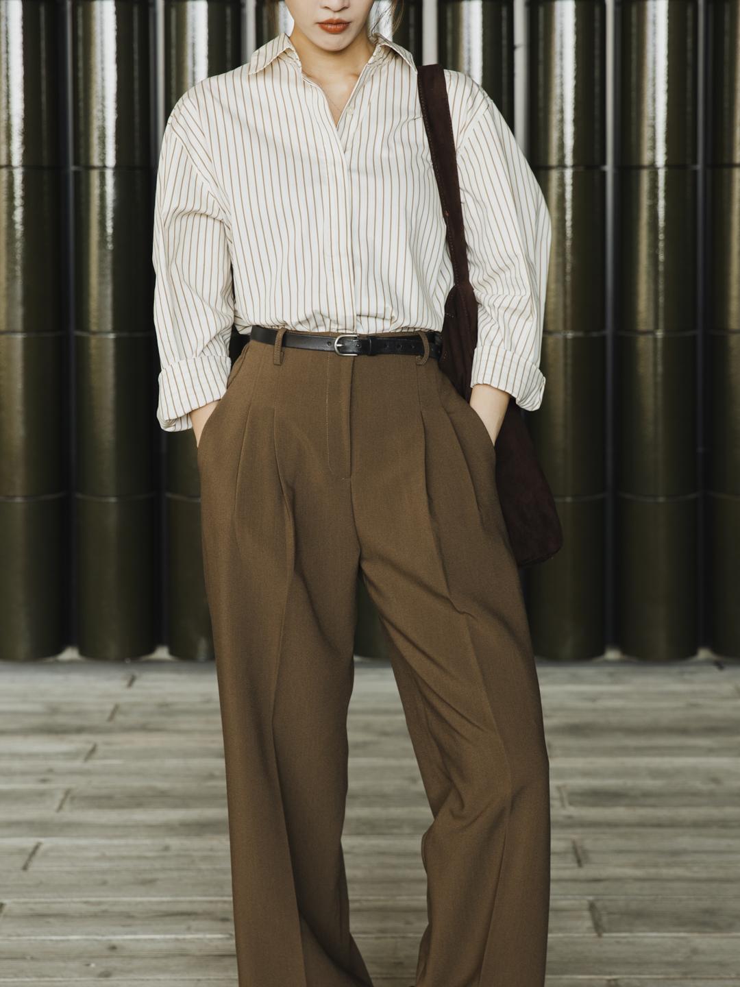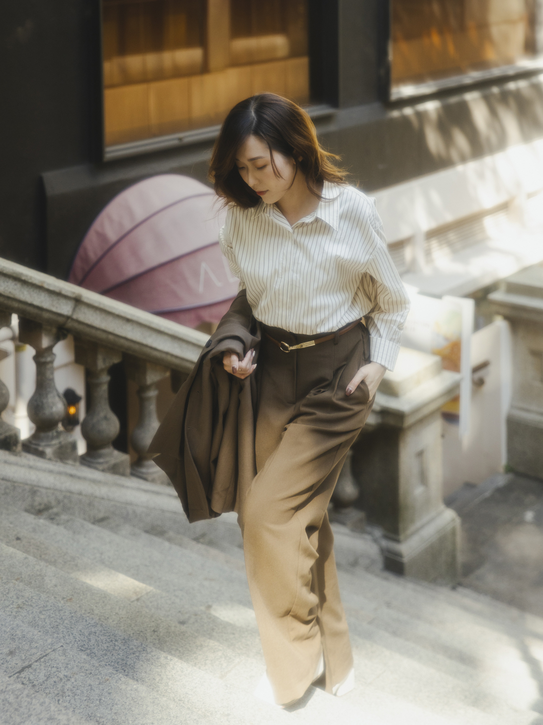 低調而溫柔,安靜的輕奢侈。恤衫上暗啡色條子間隔着亮面麻花線,雙層布料隱藏鈕扣排設計盡顯心思,細節不張揚卻足以展示品味。