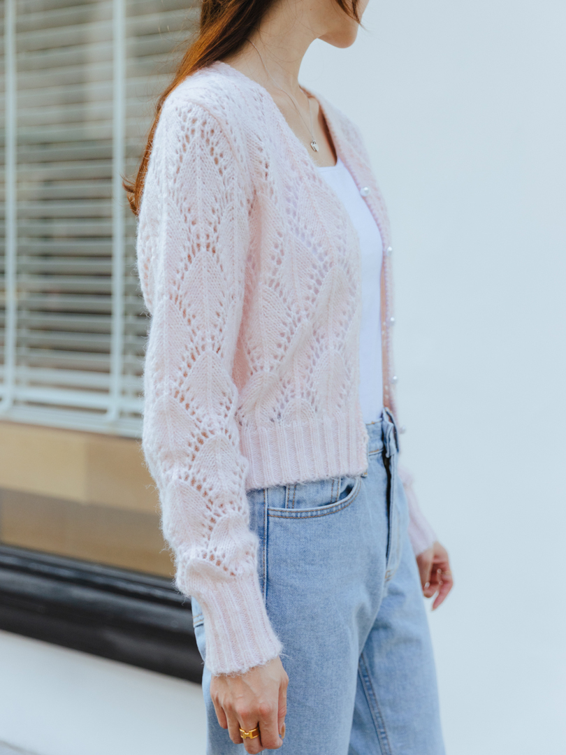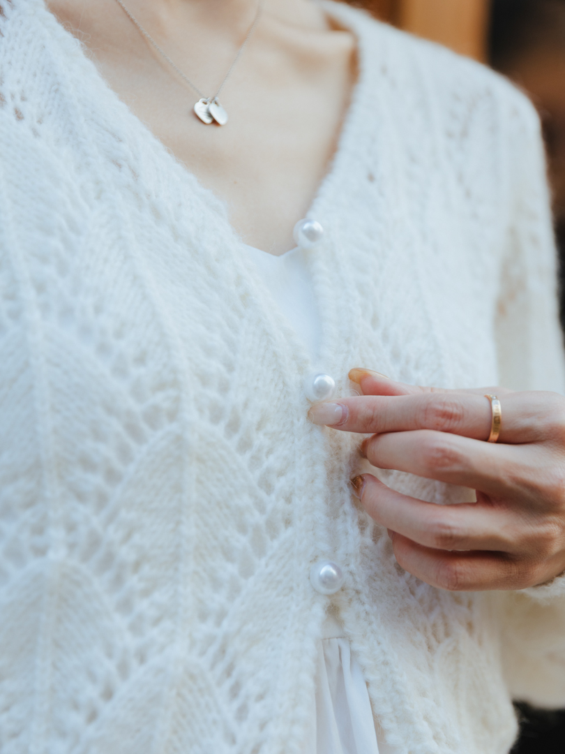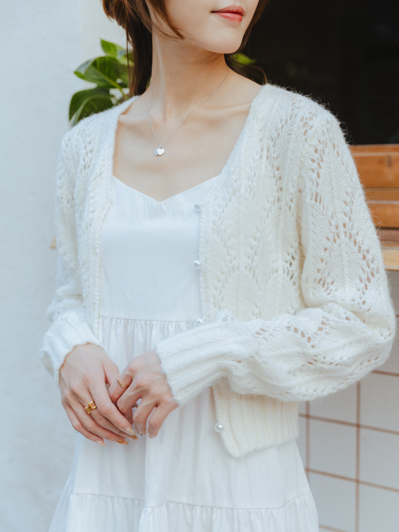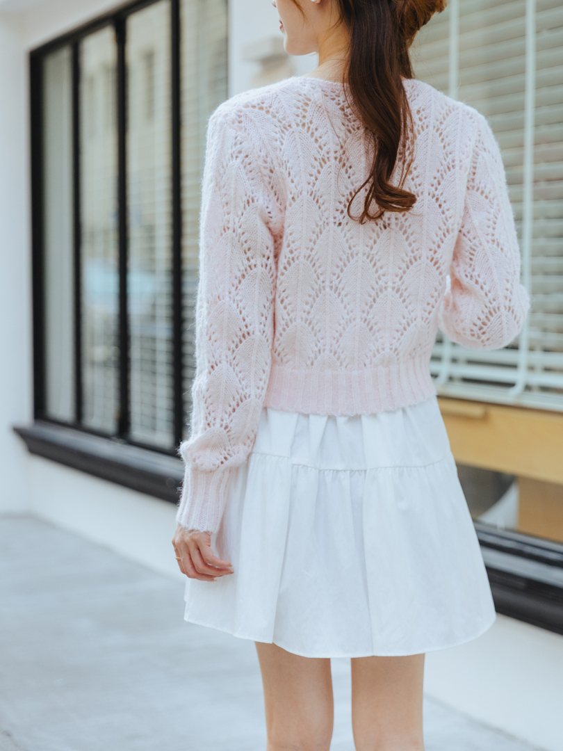 這修腰版針織外套以細膩鏤空紋理,構造輕盈層次感,讓整體多了幾分透氣與柔美,適合內搭簡約背心或連身裙。剪裁巧妙拉高腰線,嬌小女生也能輕鬆駕馭。細節上選用了仿珍珠光澤立體鈕扣,精緻感滿分,讓整件外套佩戴了飾品一樣,散發優雅的法式氣質。