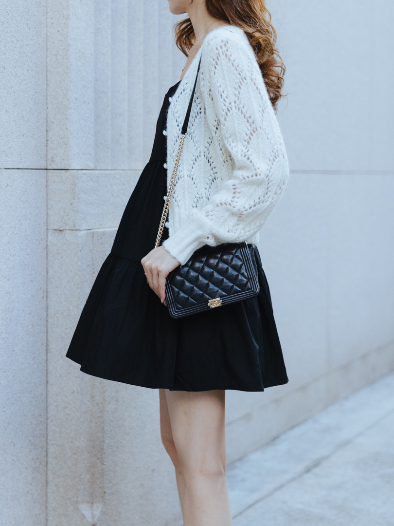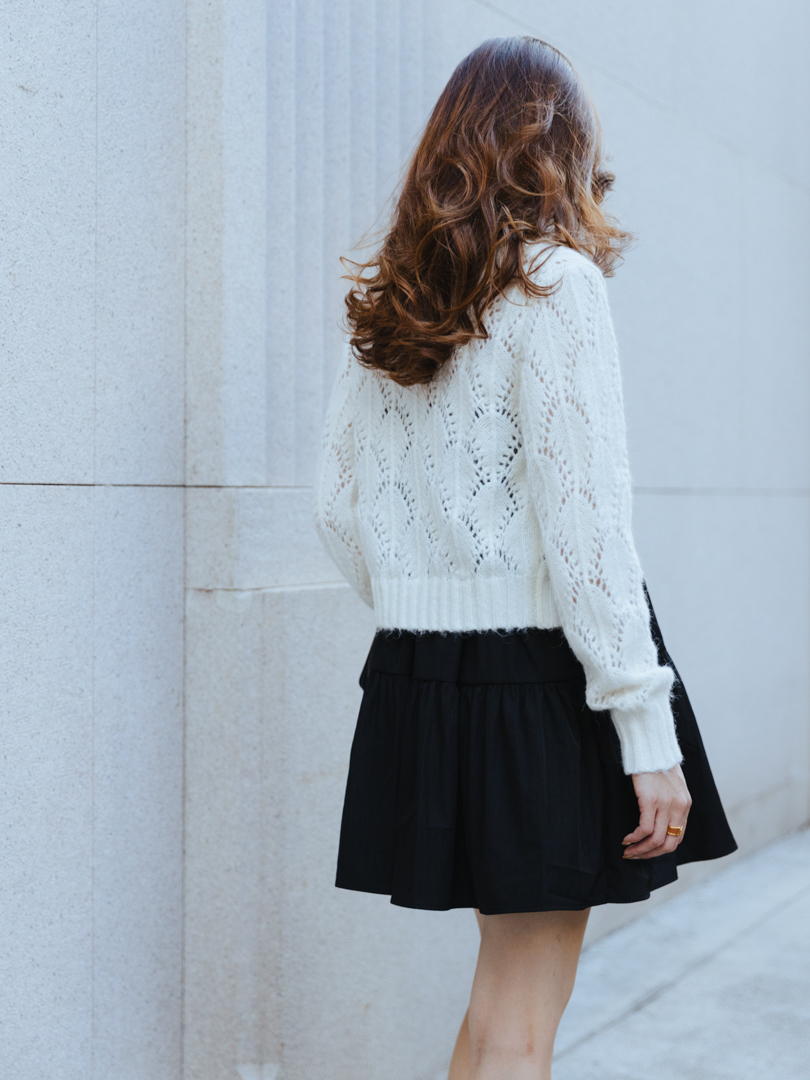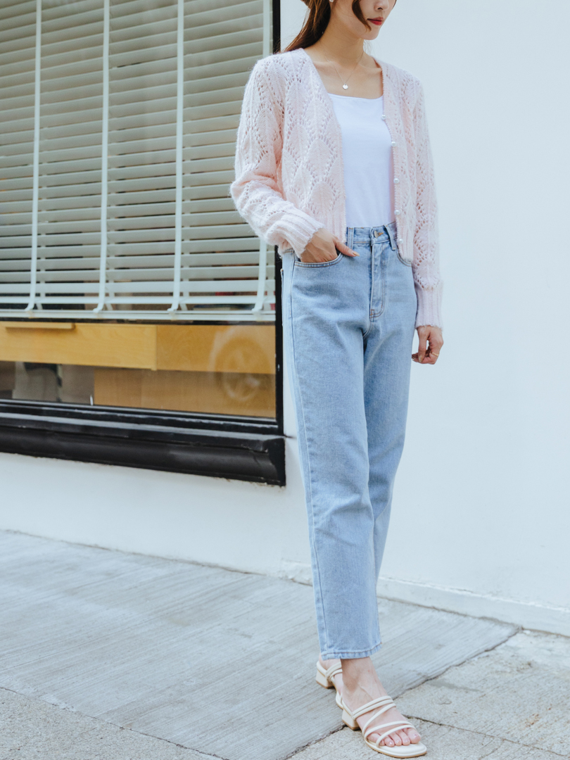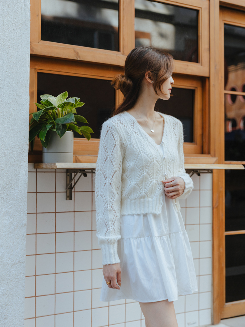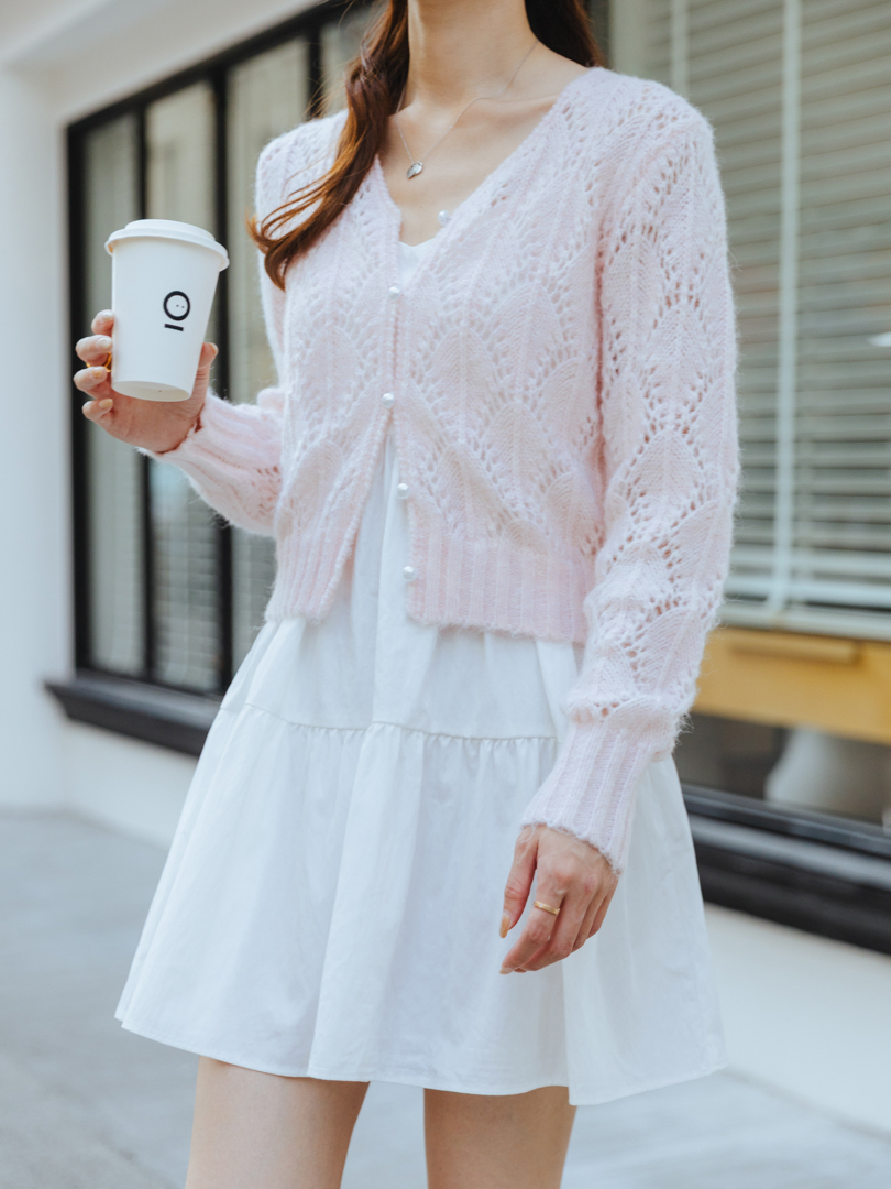 這修腰版針織外套以細膩鏤空紋理,構造輕盈層次感,讓整體多了幾分透氣與柔美,適合內搭簡約背心或連身裙。剪裁巧妙拉高腰線,嬌小女生也能輕鬆駕馭。細節上選用了仿珍珠光澤立體鈕扣,精緻感滿分,讓整件外套佩戴了飾品一樣,散發優雅的法式氣質。