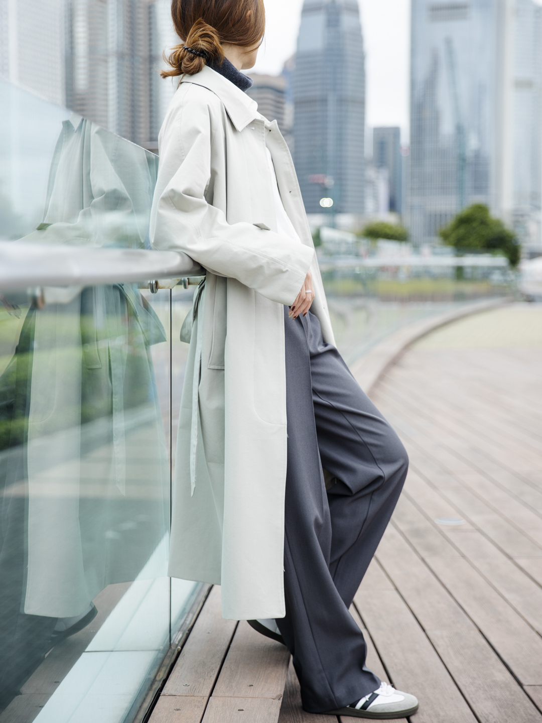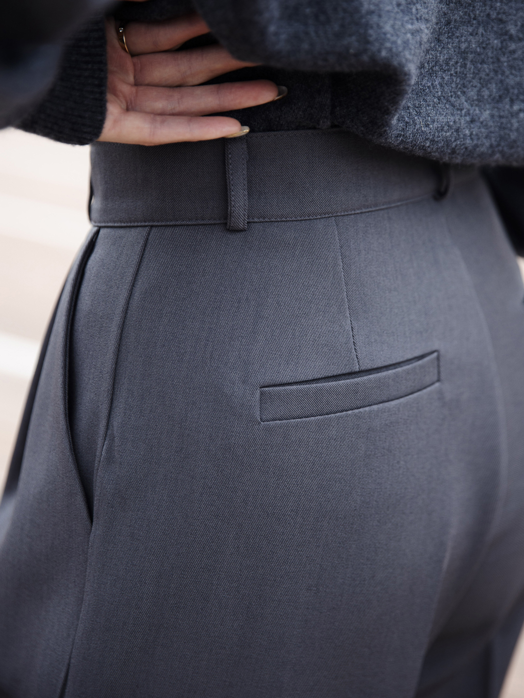 高質挺身面料不易起毛,單熨線褶骨令剪裁更立體俐落,包覆梨型下身,塑造直腳線條。屬近年流行的落地款長褲,休閒、通勤、簡約中性造型皆可。