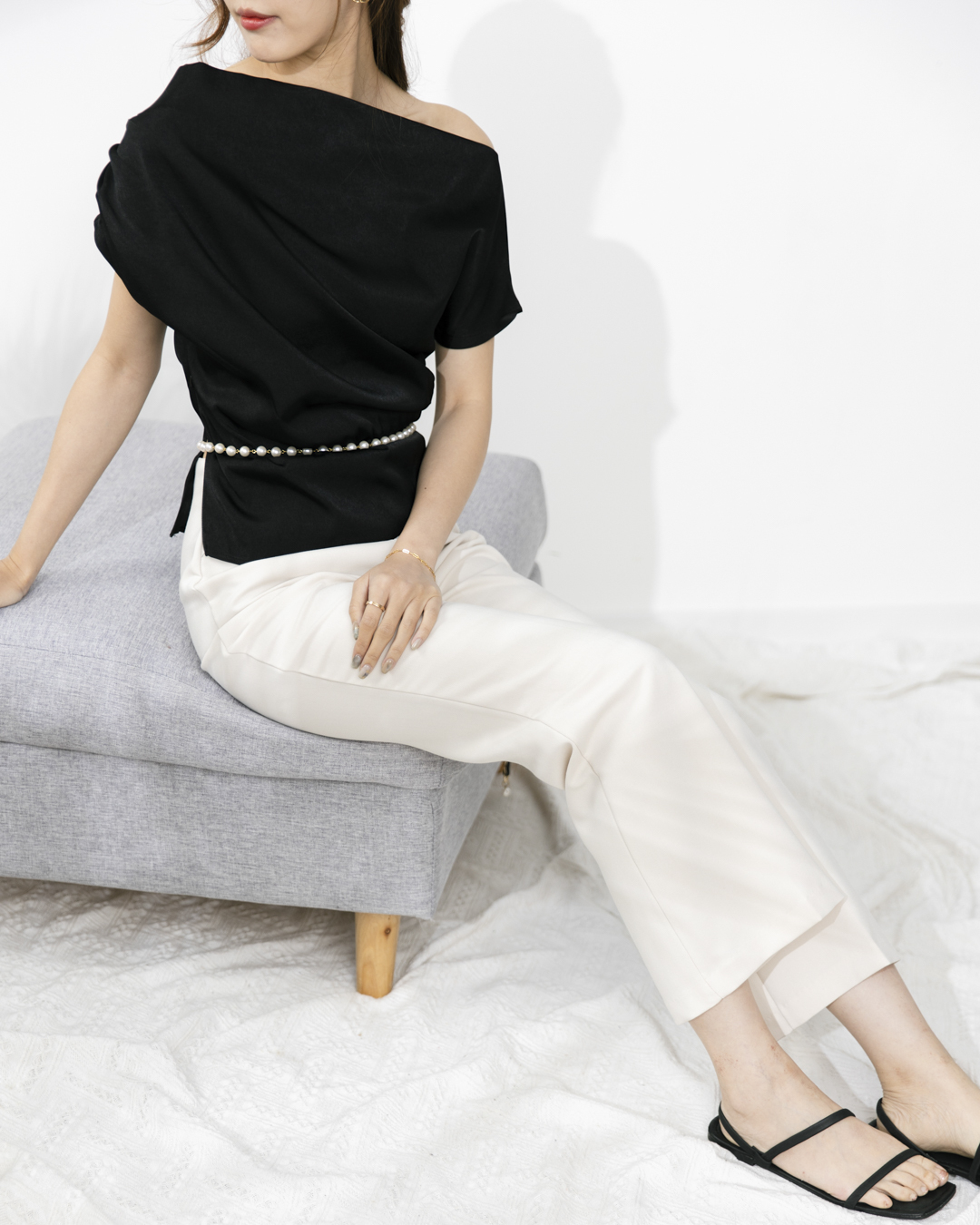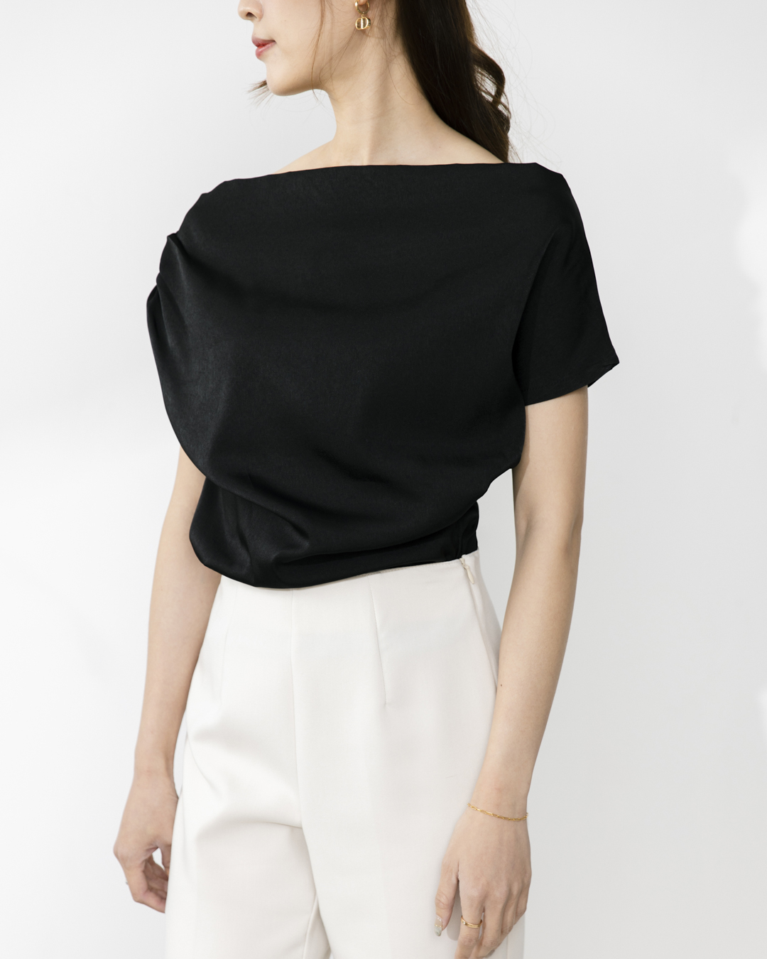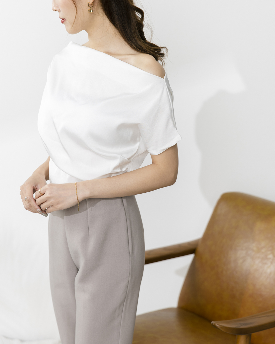 🪩緞面斜肩修腰上衣👑 (兩色入)