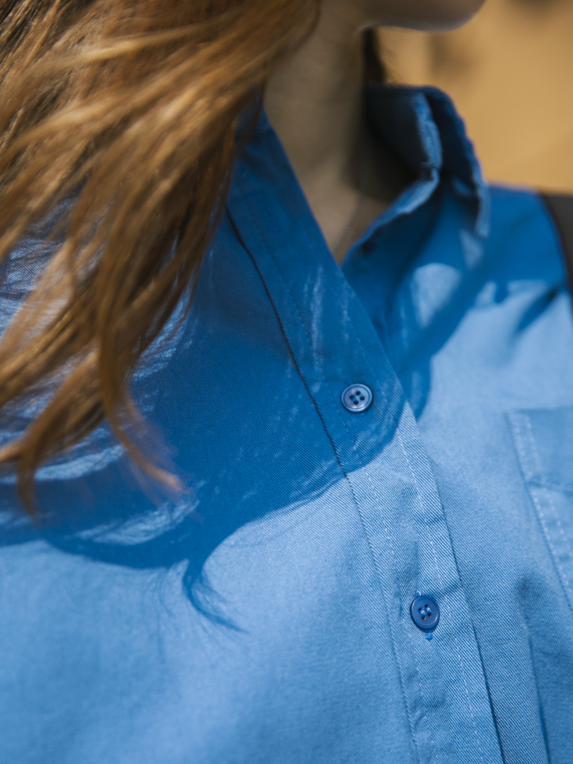 流行的高彩度藍色襯衫採用略微寬鬆的剪裁,帶有休閒感,全棉質物料耐着耐洗又易打理,反摺的袖口讓造型更具隨性感,日常通勤或週末出遊均可穿着,百搭有精神。將下擺紮進褲頭或裙裝的穿法,強調腰線並修飾比例,整體更顯修長。