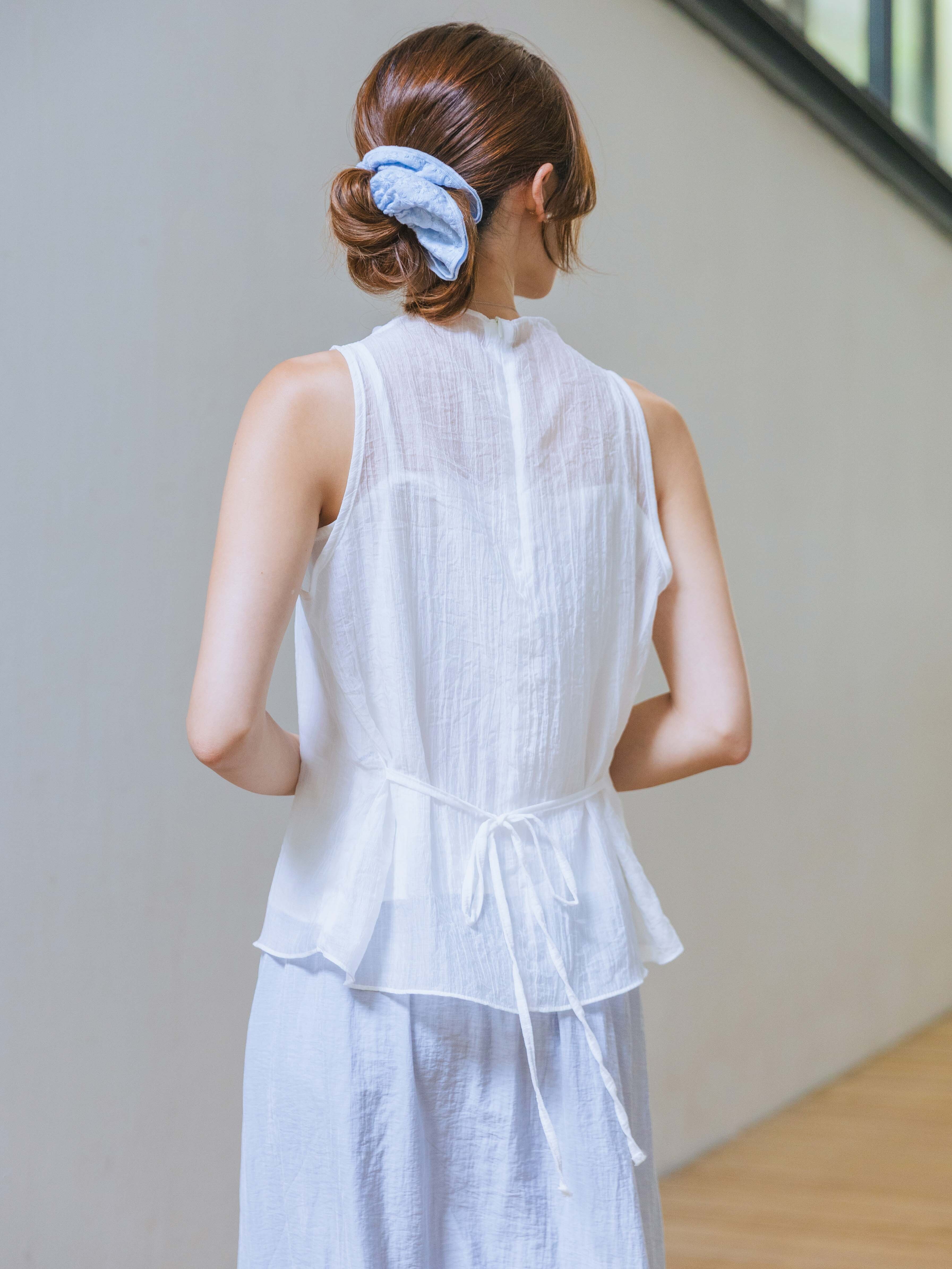 這款襯衫帶有精緻的半領設計,兩肩打褶點綴優美,裸粉色與白色同樣充滿女性氣息。腰帶突出了線條美,還可以繫上蝴蝶結,營造出奢華的穿著感。