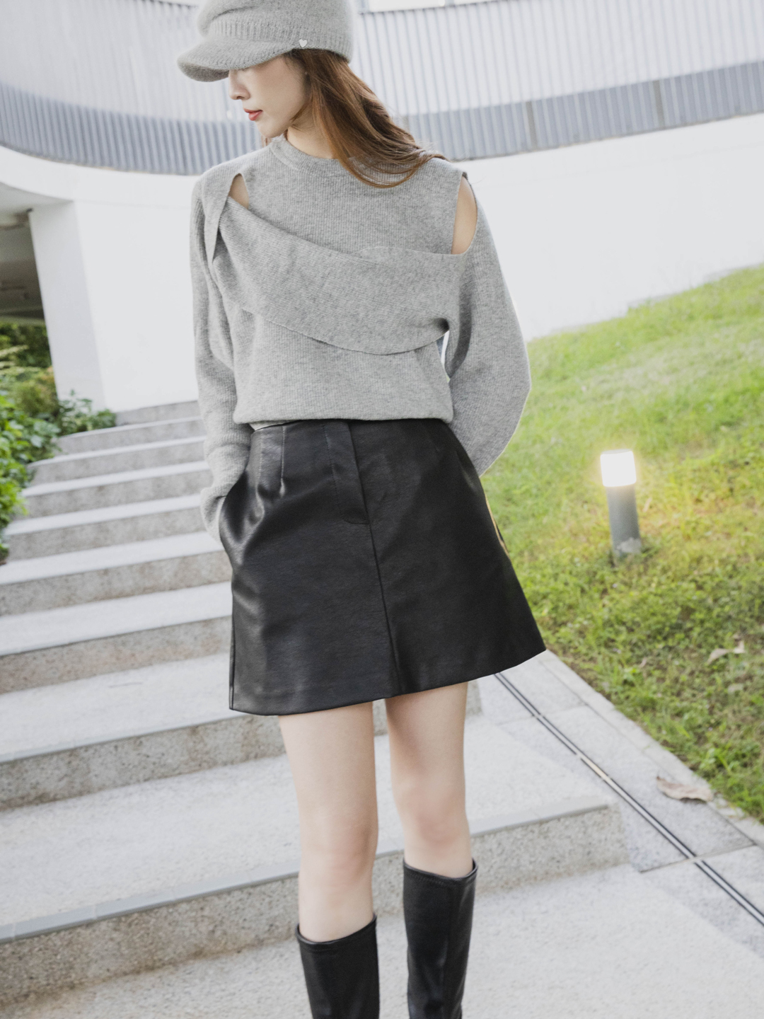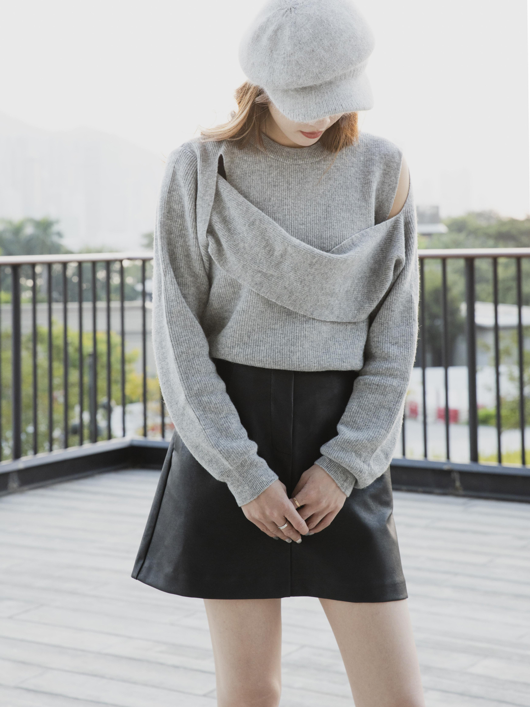 設計別出心裁的毛衣,切合喜歡與別不同的妳,胸前不對稱流線布勾勒出抽象的個性。優質布料混50%羊毛,厚度不透膚,時尚與實際兼備,即使肩下鏤空,於冬日仍然額外保暖。