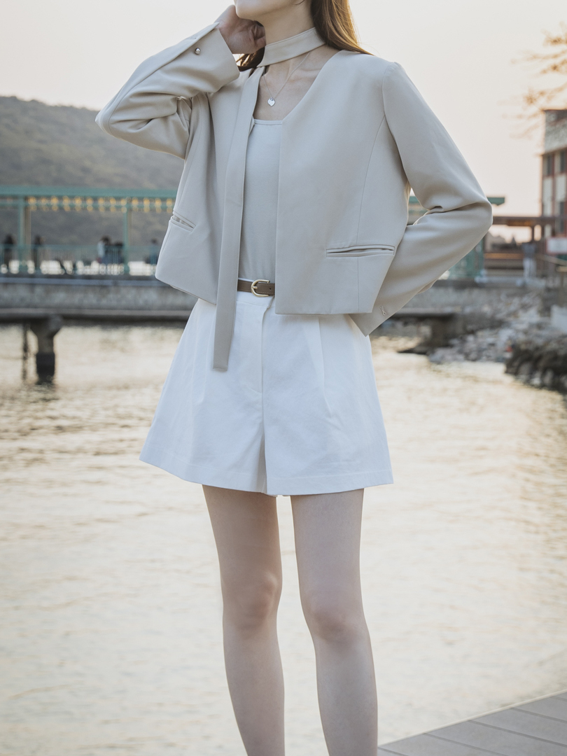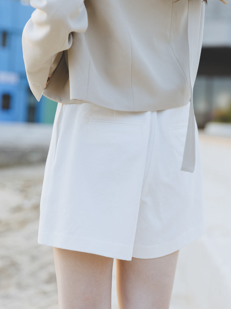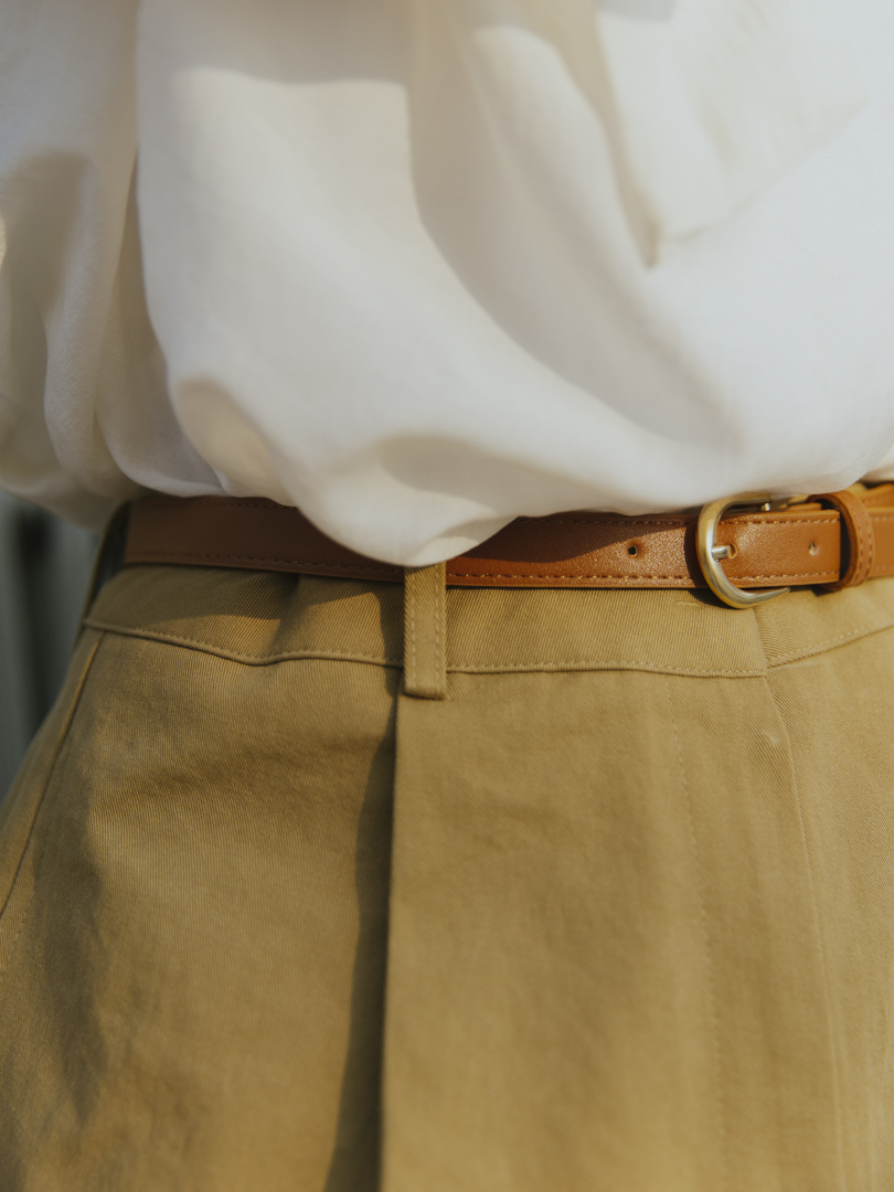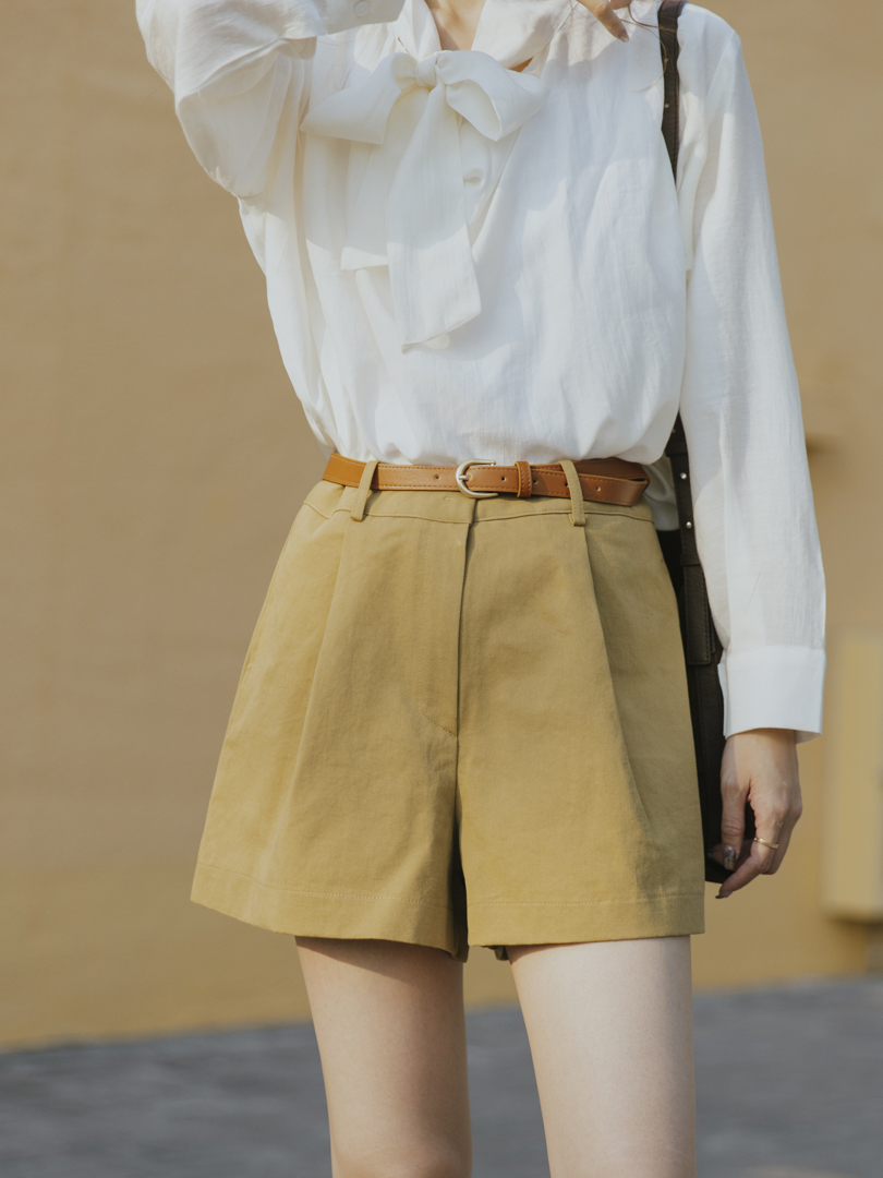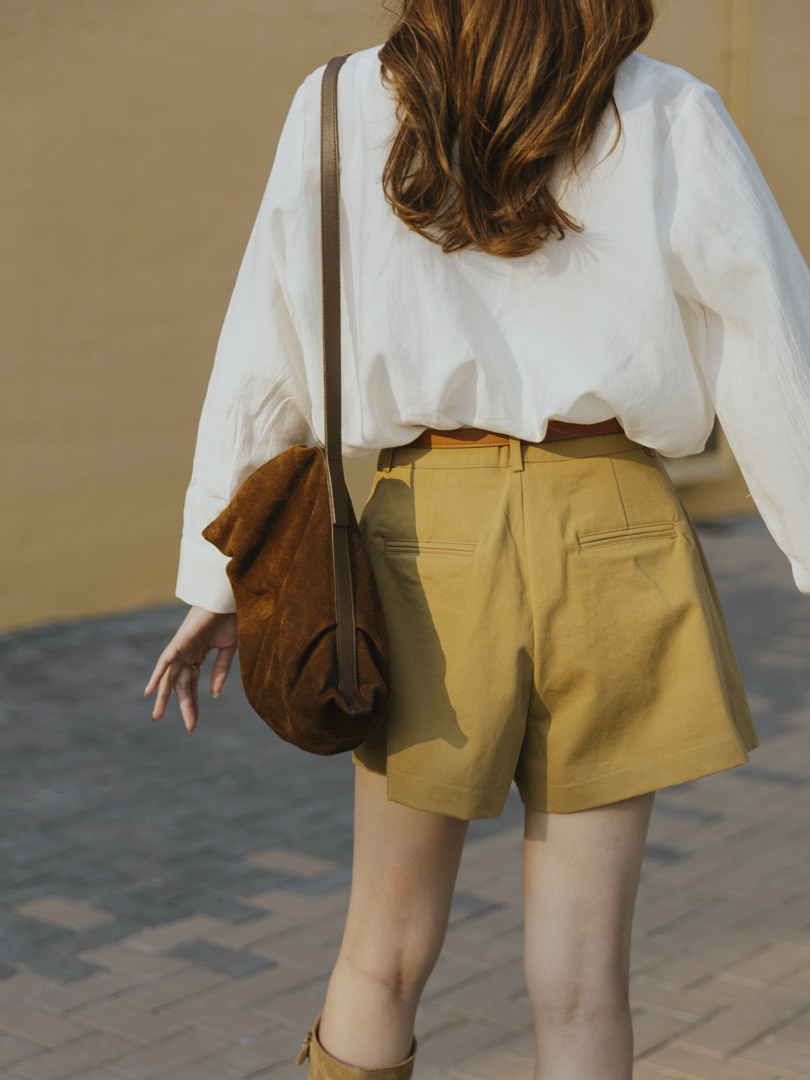 短褲的挺版剪裁修飾腿型,輕微A字褲管向外微張,自然修飾大腿最寬處,能為不同身材打造挺拔而乾淨的輪廓線。打褶為褲身的腹部與大腿前增添立體空間感,包客度高,穿著更舒適,視覺上更顯瘦,有助於平衡梨形身形。兩側採用隱藏於褲骨的口袋設計,極簡而俐落,同時選用中挺度的斜紋布料,不貼膚而保持清爽舒適。兩色短褲各附指定顏色皮帶一條,凡購買即擁有一套。
