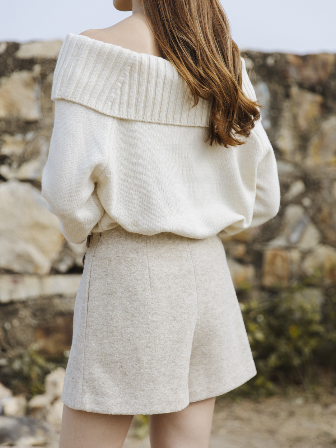 獨特的軟熟毛料質感,有如被大浴巾舒適包裹着,不像普遍硬梆梆的厚面料。前後均車有腰線修形,隱藏式拉鍊及前裹身裙褲設計方便穿着,雙帶扣造型更顯型格,提升時尚感。